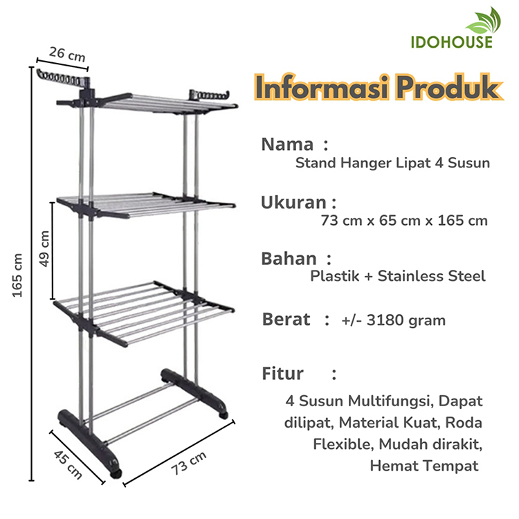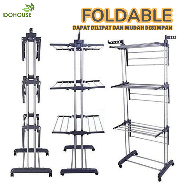 [Star] Rak Jemuran Baju Lipat Pakaian Serbaguna Roda 4 Susun Stainless Hitam Putih Anti Karat Tahan Beban 40 Kg