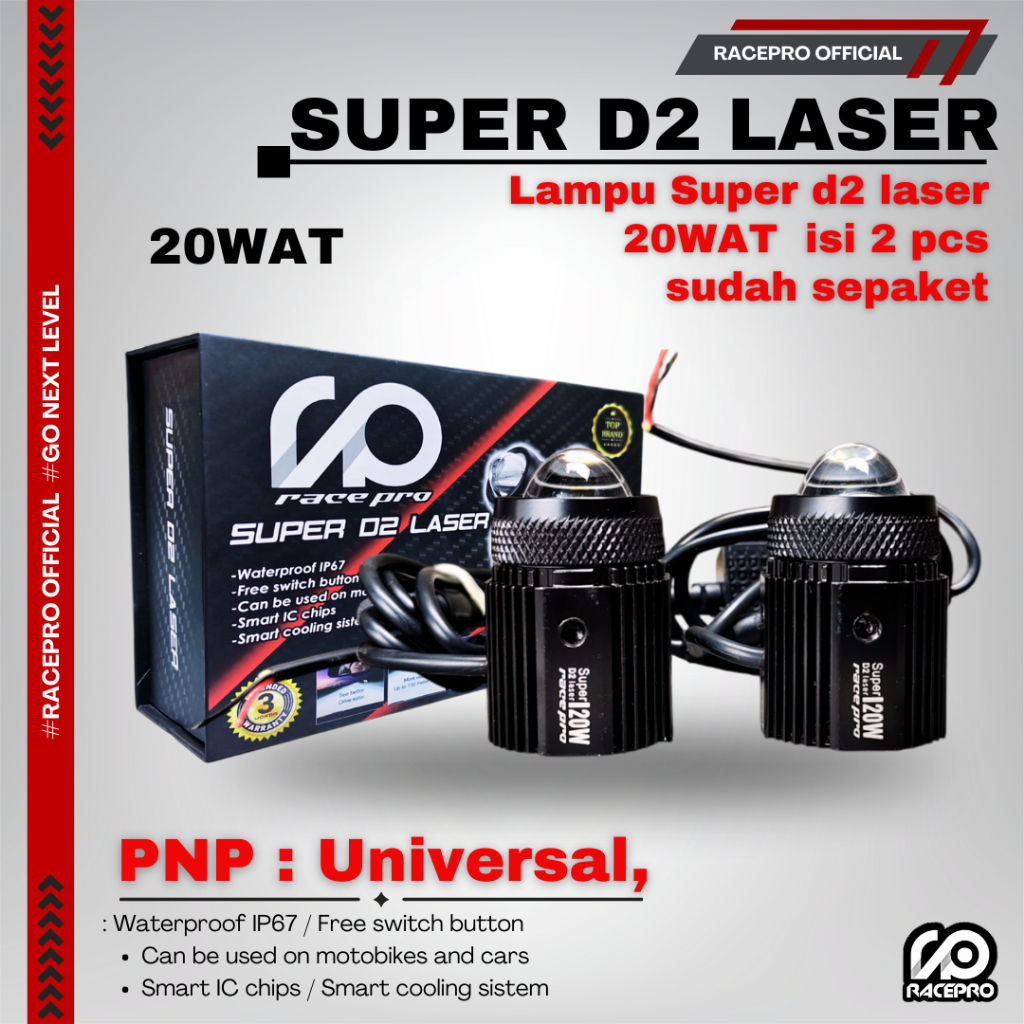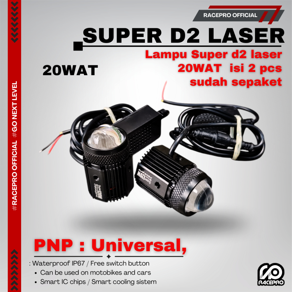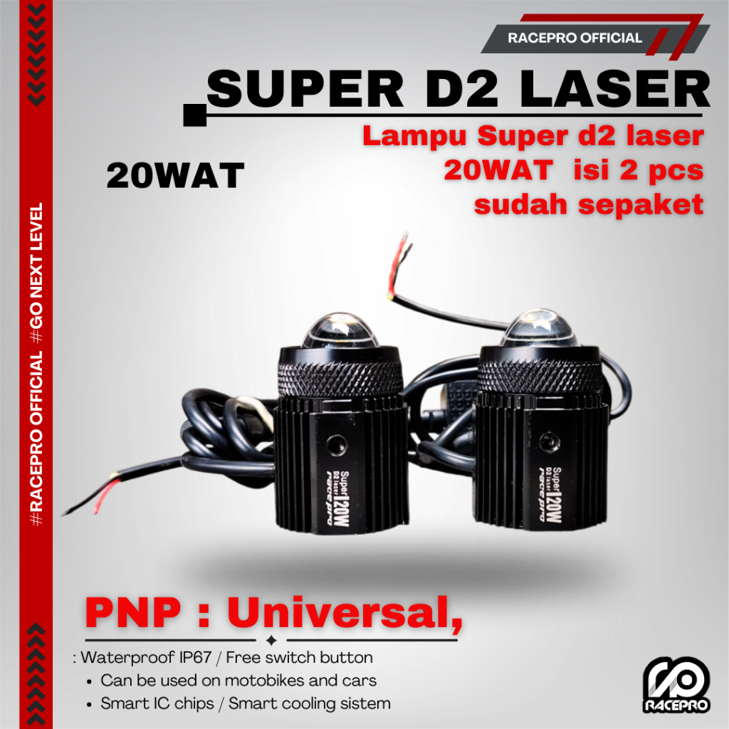 [Star] Racepro Super D2 Laser 20wat isi 2 pcs 1 box waterproof IP67 lampu laser d2 racepro