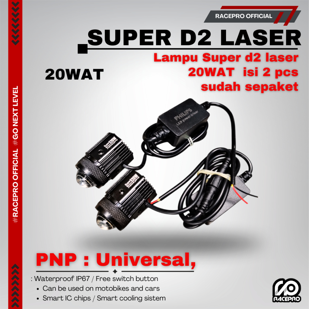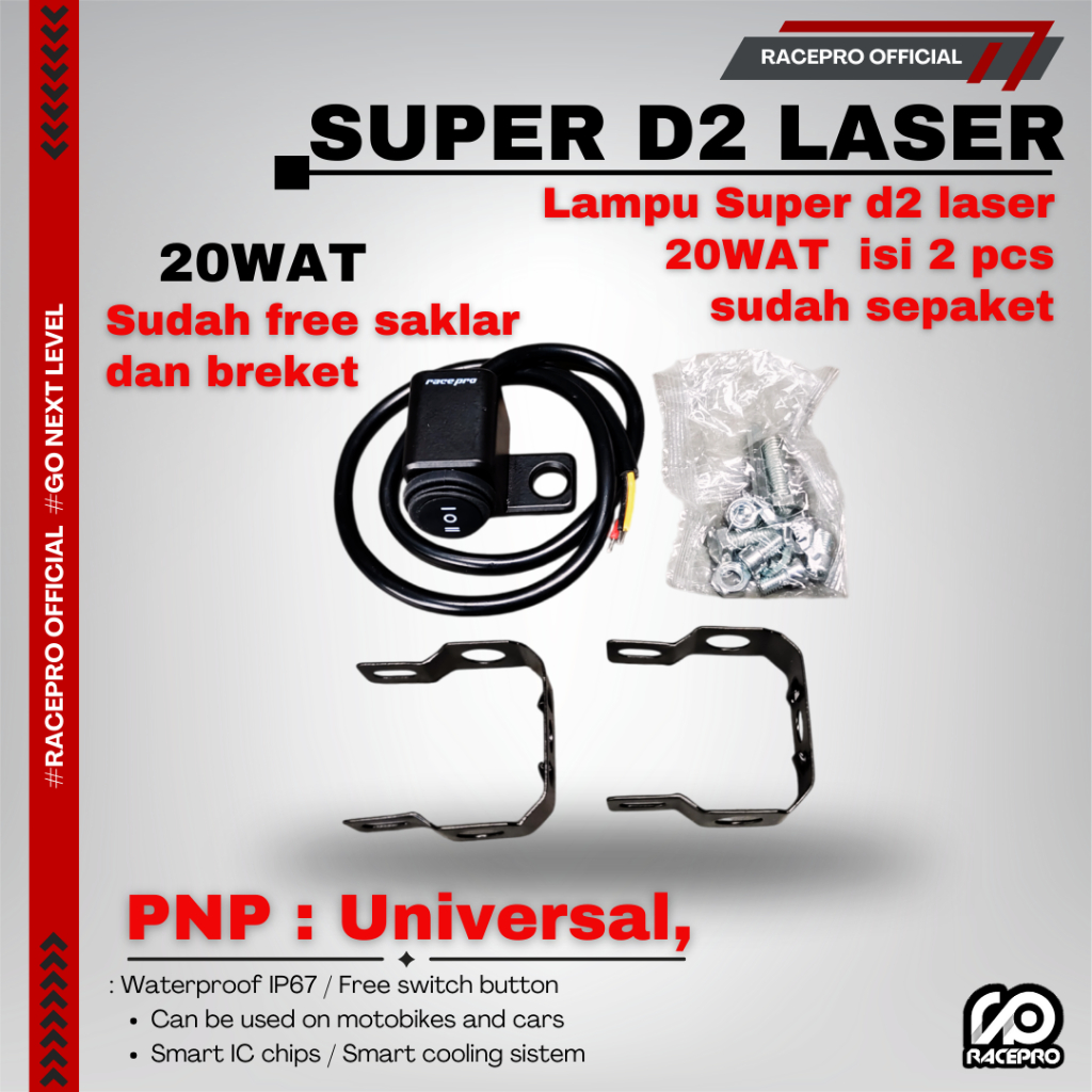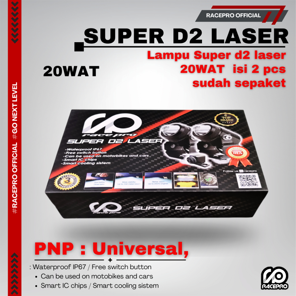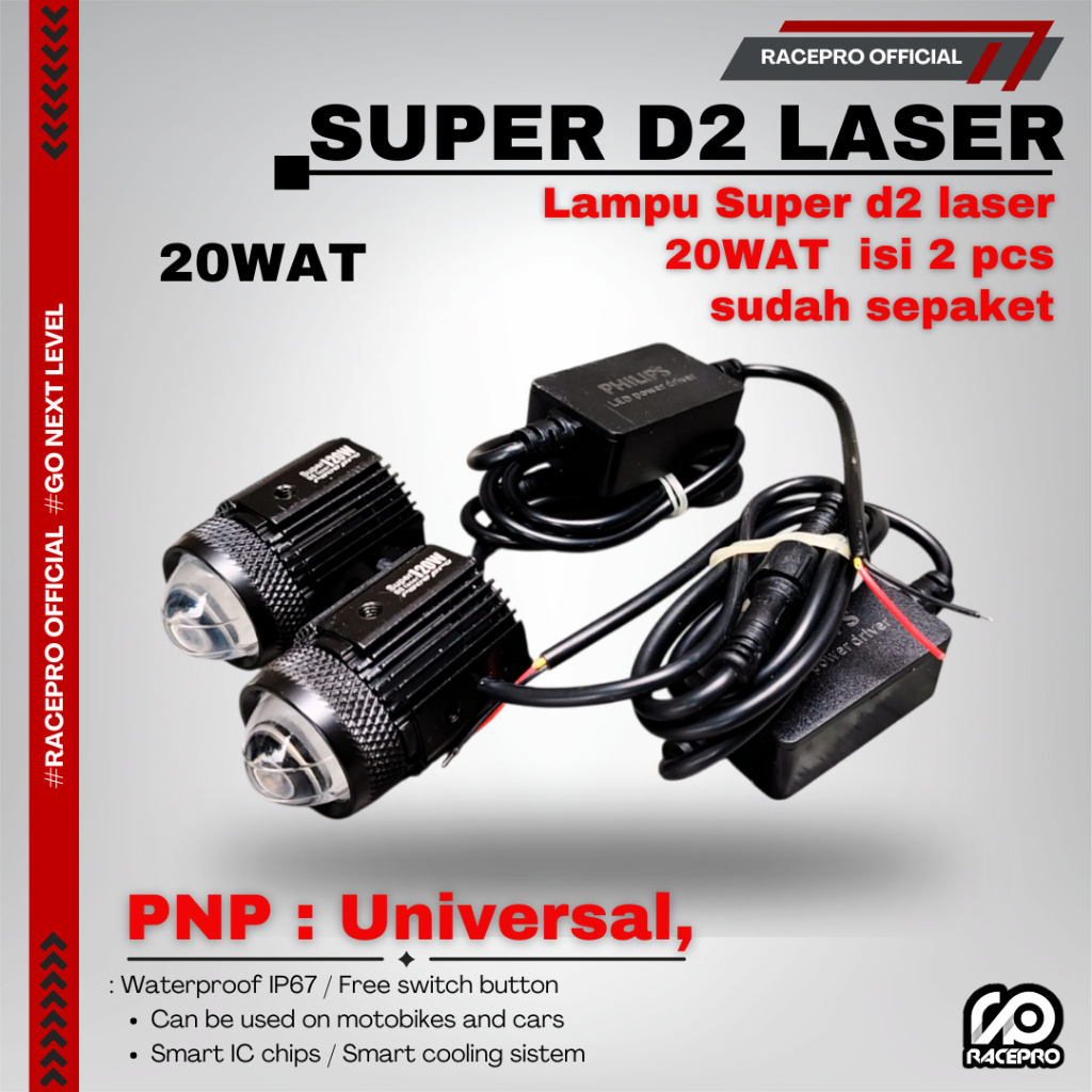 [Star] Racepro Super D2 Laser 20wat isi 2 pcs 1 box waterproof IP67 lampu laser d2 racepro