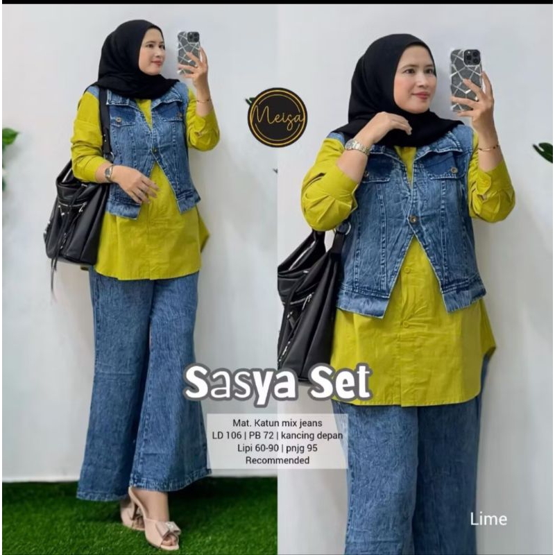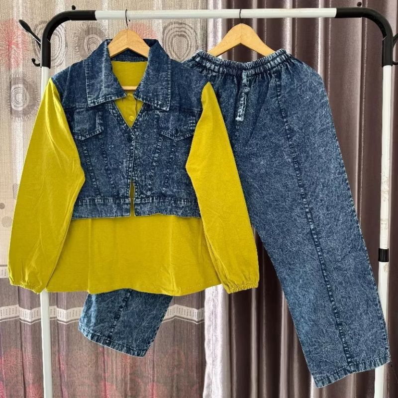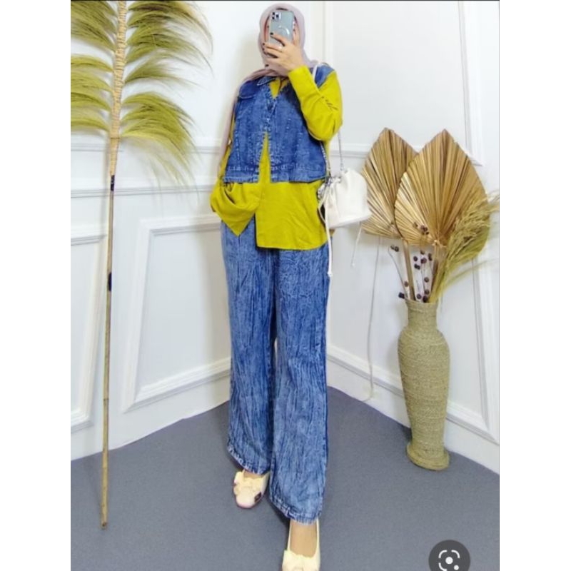 Alexa Set (Set Soraya) Setelan Kemeja Jeans dan Celana Cutbray, Kemeja Jeans Kombinasi Bahan Jeans Muslim Wanita Kekinian Korean Style