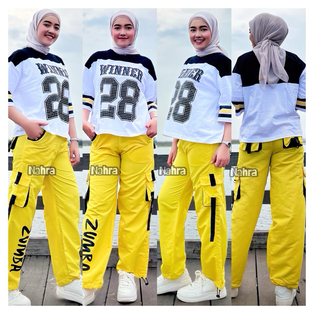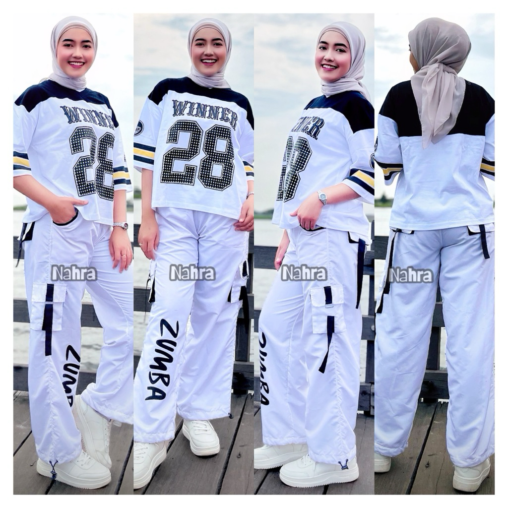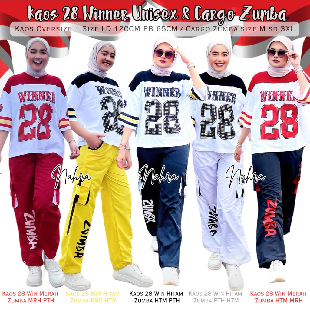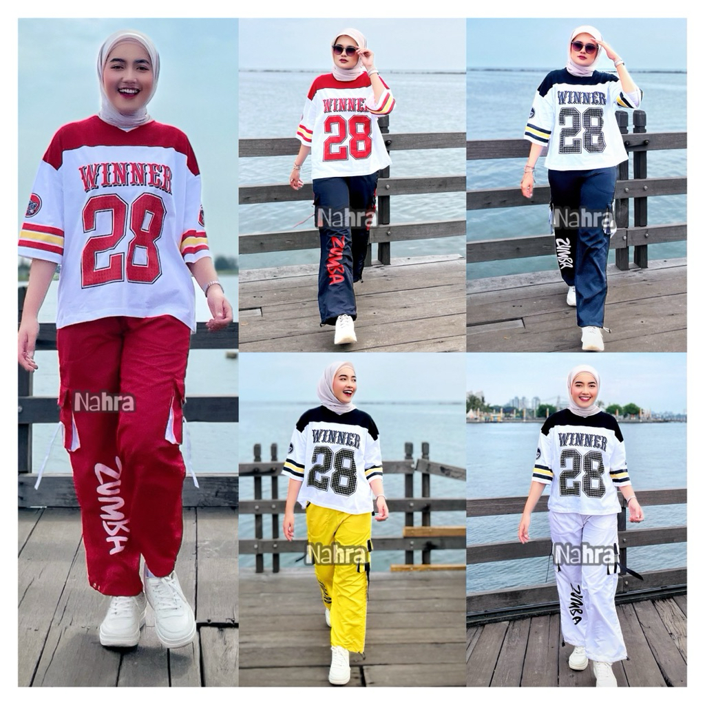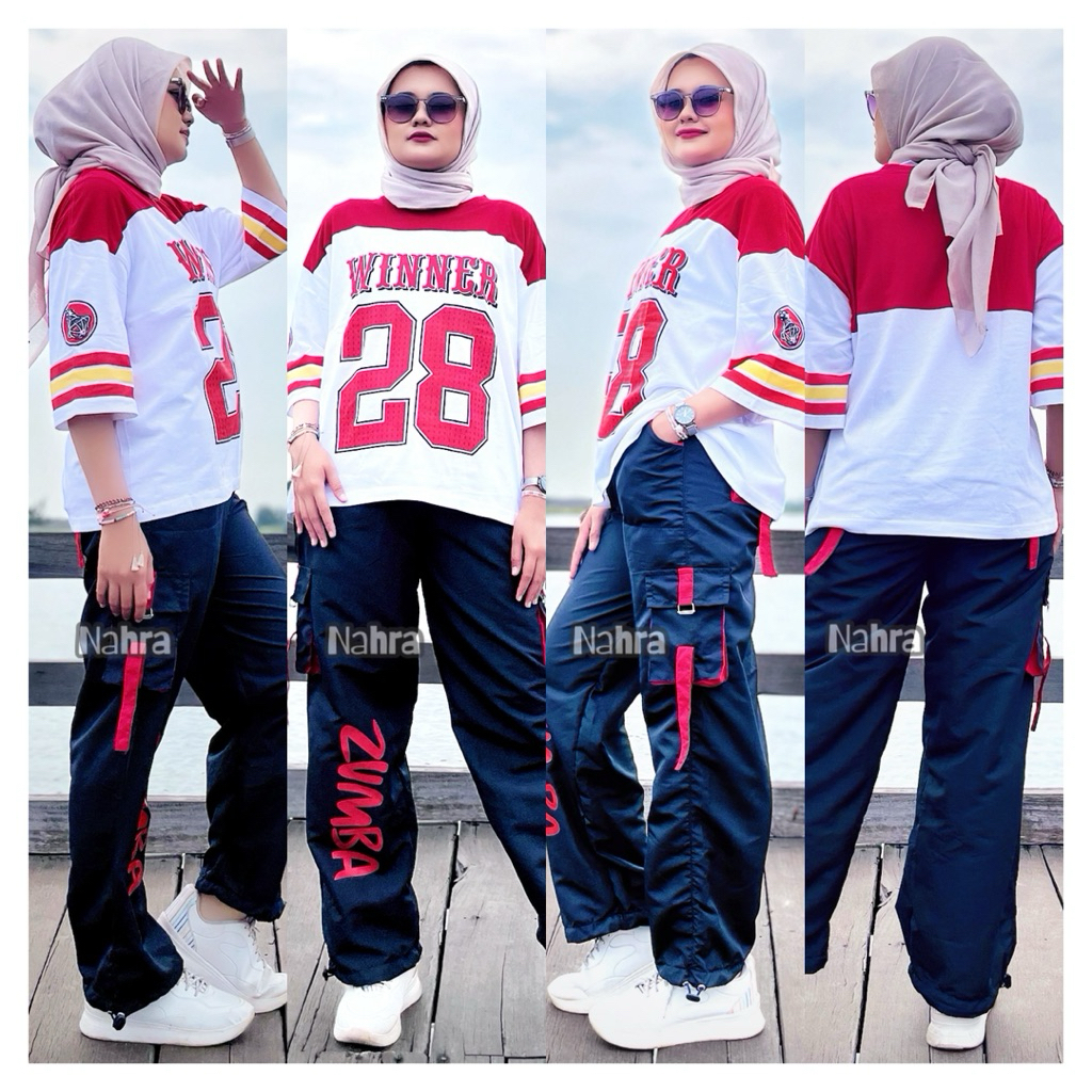 Setelan Kaos Winner 28 Unisex & Cargo Zumba 1SET Bahan Katun Combat 24s dan Celana Bahan Parasut Untuk Aktifitas Olahraga & Daily