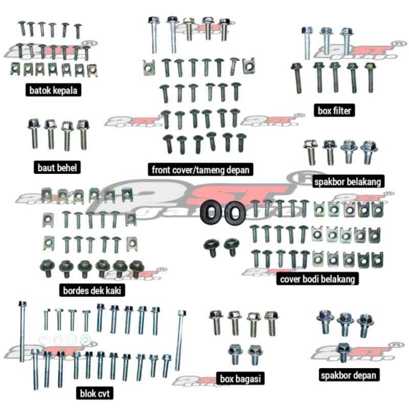 Baut body lengkap, Blok cvt+cover cvt, Body belakang, tameng depan, Dek kaki, Batok kepala, Box bagasi, Fulset bodi+blok cvt