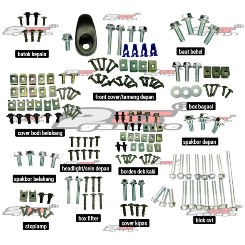 Body lengkap+cvt, Body belakang, Front cover/Tameng, Baut behel, Body lengkap, Blok cvt, Bordes dek kaki, Batok kepala, Box bagasi