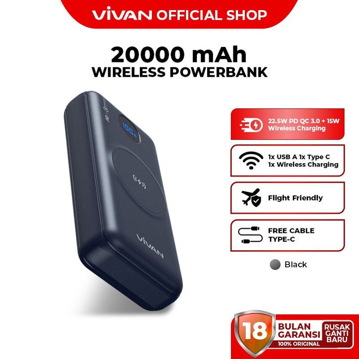 VIVAN Wireless Powerbank 20000 mAh VPB-W20 3 Output 22,5W Fast Charging Garansi 18 Bulan