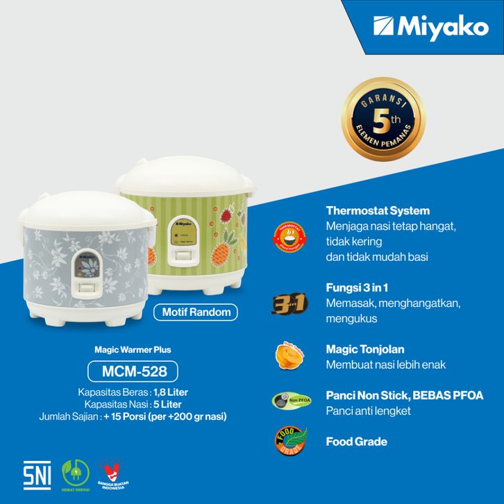 Miyako Magic Com 1.8 Liter 3in1 395 Watt MCM528 Ricecooker Food Grade Resmi MCM 528