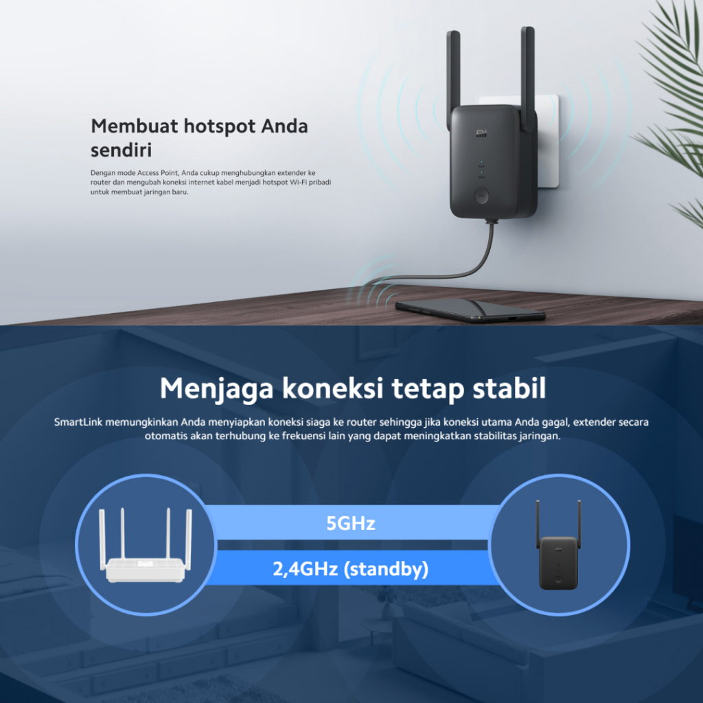 Xiaomi WiFi Range Extender AC1200 2 Eksternal Antena Dual-band 2,4 GHz dan 5 GHz Kecepatan Hingga 1200Mbps