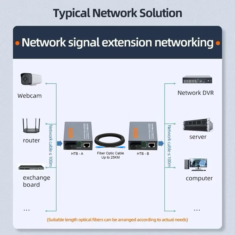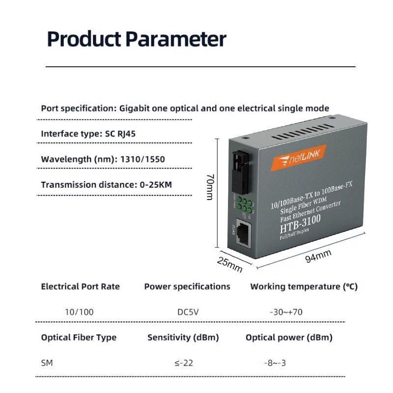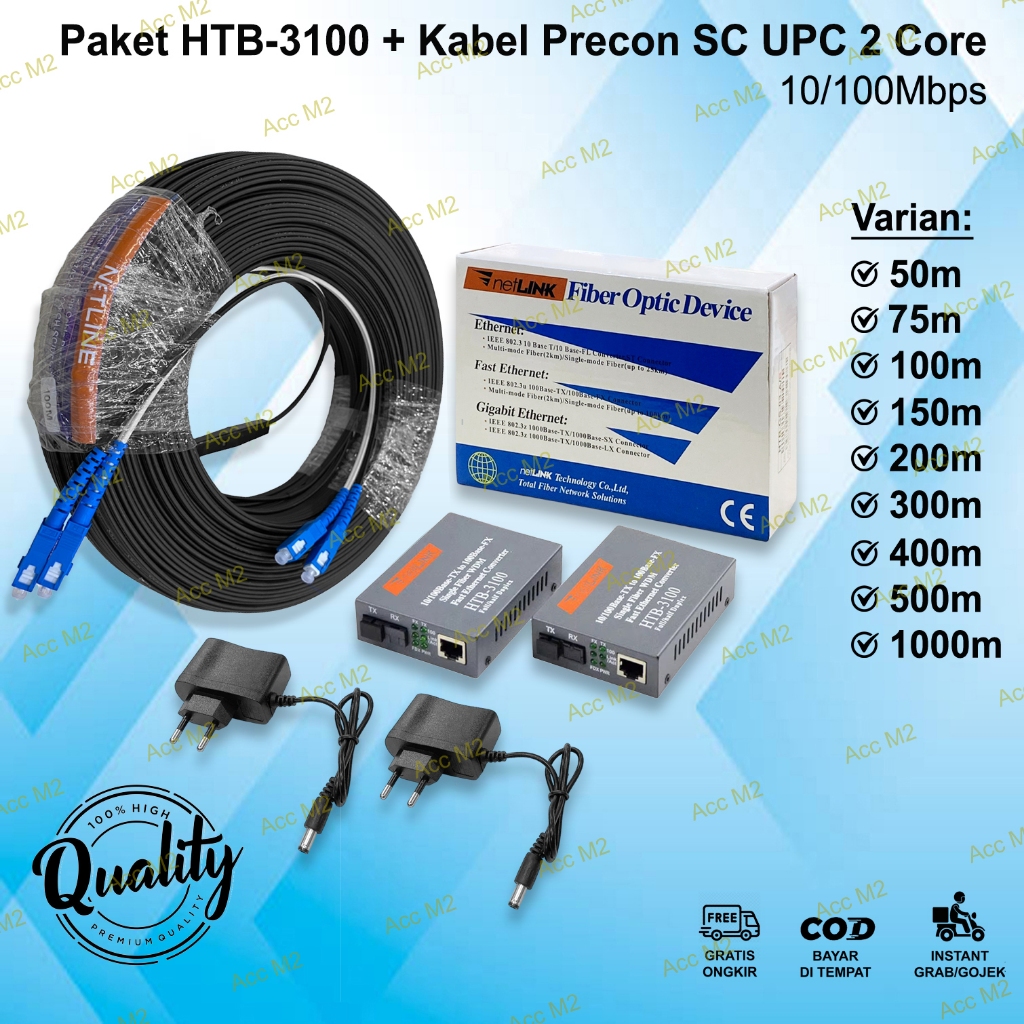 Paket HTB-3100 10/100Mbps + Kabel Precon Fiber Optic SC-UPC 2 Core Single Mode Outdoor 3 Sling 50m, 100m, 150m, 200m, 30