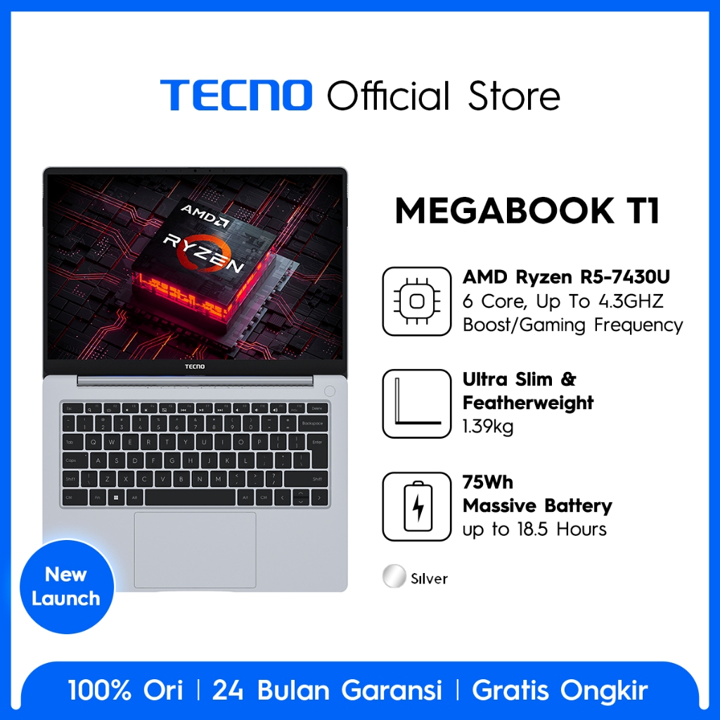 TECNO MEGABOOK T1 R5 - 16GB+512GB, AMD Ryzen 5-7430U, 100 PERSENSRGB Display, 75Wh Battery, 65W Type-C GaN PD Fast Charge , DT