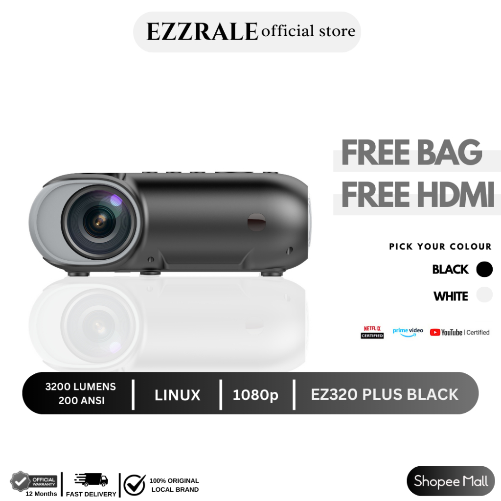 EZZRALE EZ320+ (Plus) 3200 Lumens ( 200 ANSI ) Smart Projector LINUX Netflix Verified