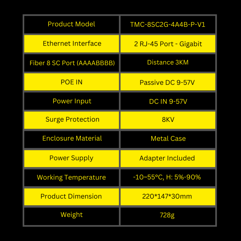 Tarmoc TMC-8SC2G-4A4B-P-V1 Media Converter Switch 8 FO 2 LAN Gigabit POE IN 9-57V