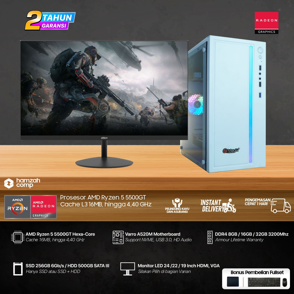 KOMPUTER GAMING RYZEN 5 5500GT RADEON 7 RAM UP 32GB SSD 256GB HDD 500GB Monitor UP 24 Inchi