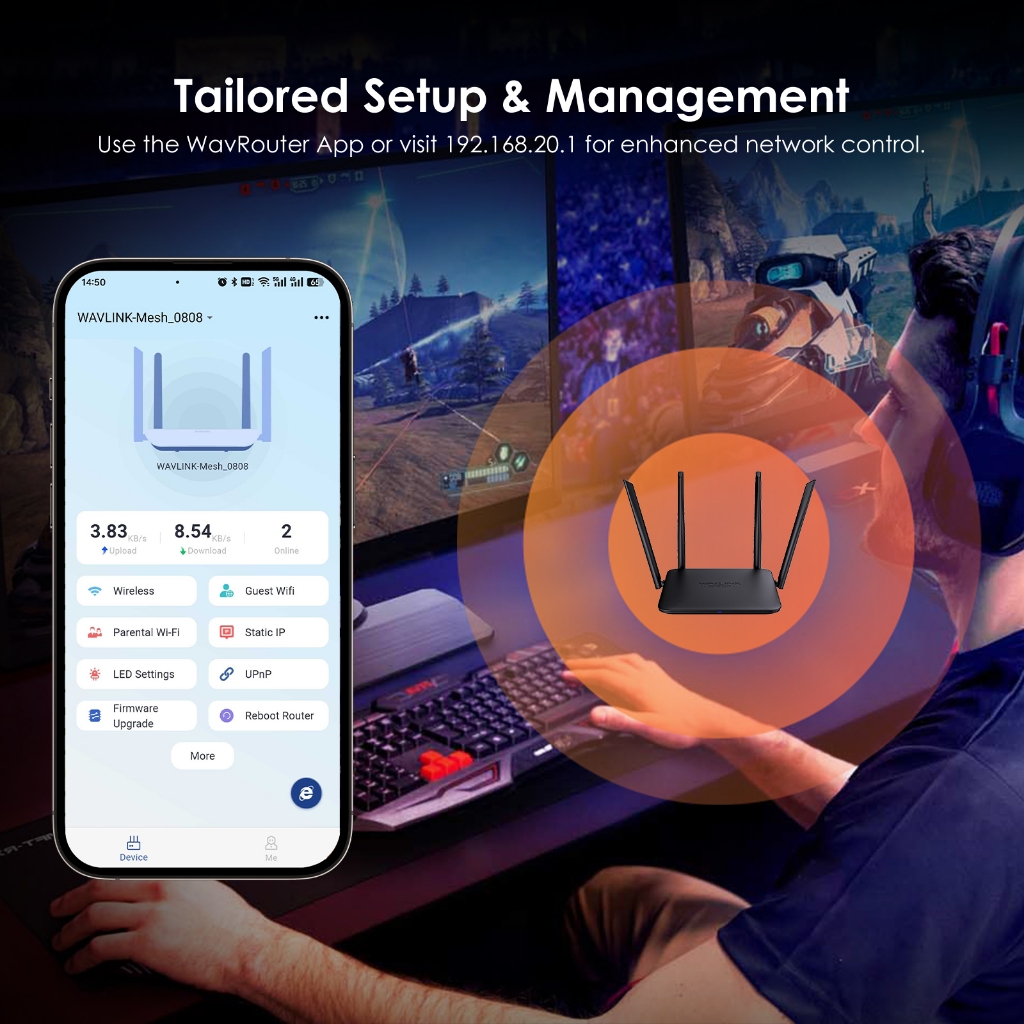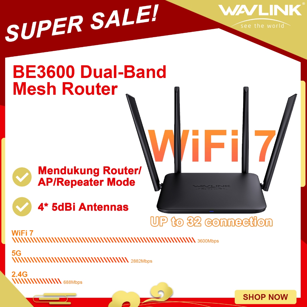WAVLINK BE3600 Wi-Fi 7 Router. Dukung 100+ perangkat, jangkauan luas dengan Mesh. teknologi MLO & 4096-QAM untuk gaming