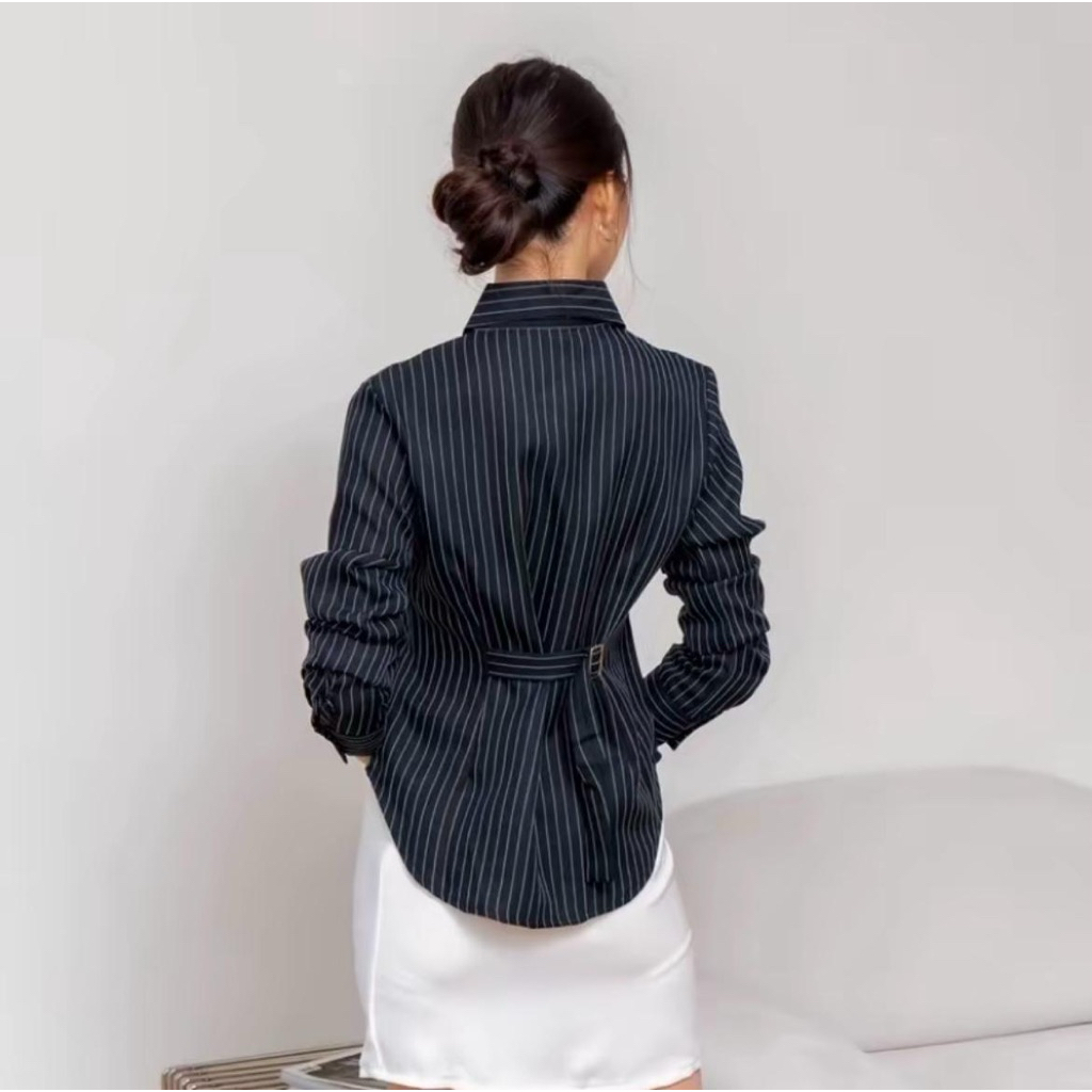 DAISY STUFF Luna Stripe Kemeja Fitted Atasan Wanita Salur Garis Garis Slim Ft Body Tali Timah Belakang Kekinian
