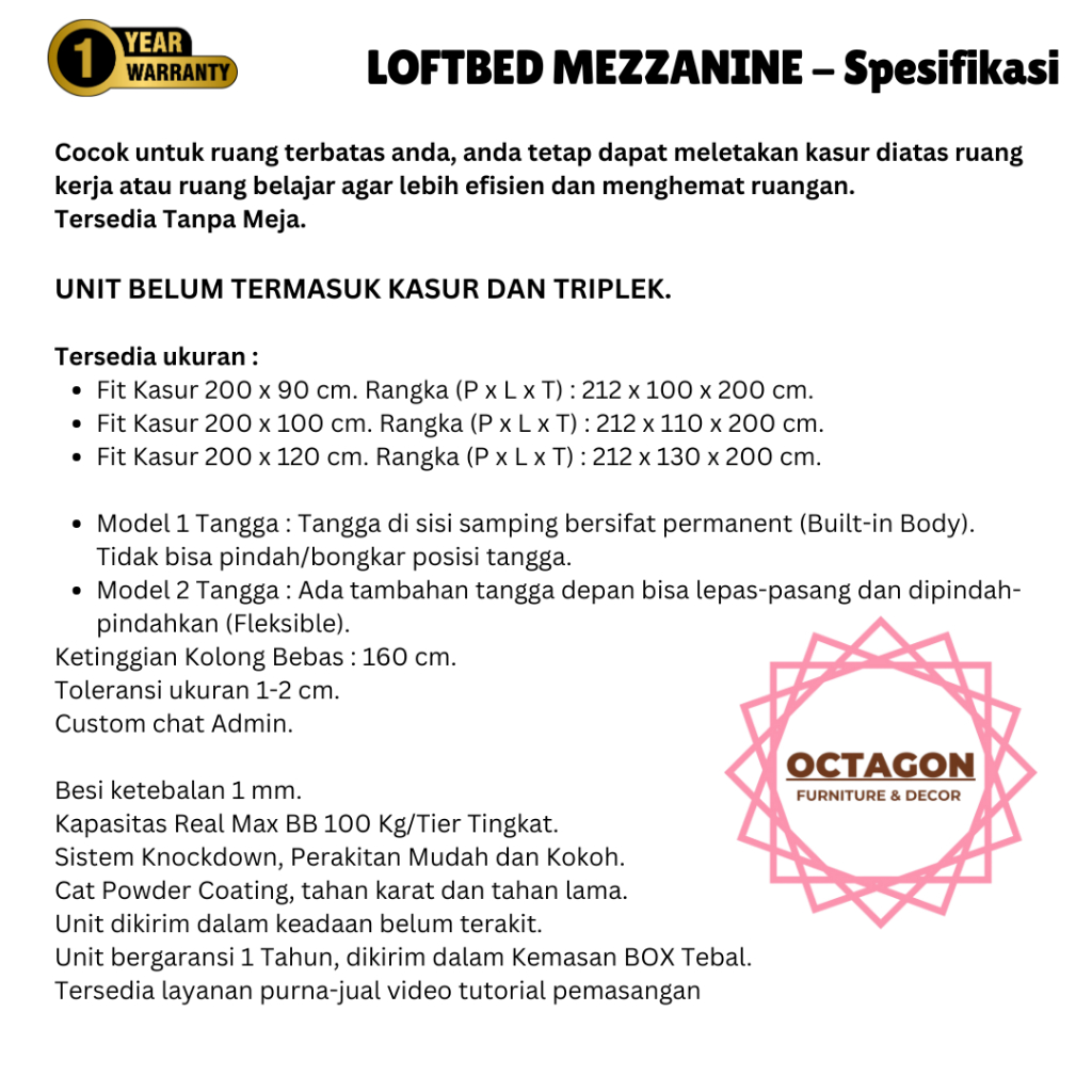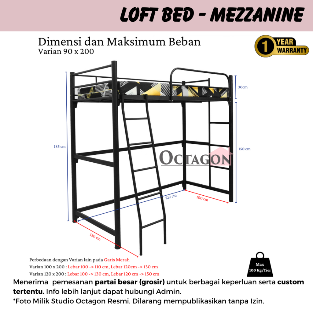 LOFT BED BESI MINIMALIS RANJANG SUSUN MEZZANINE FLOATING 90X200 100X200 120X200 ST LB