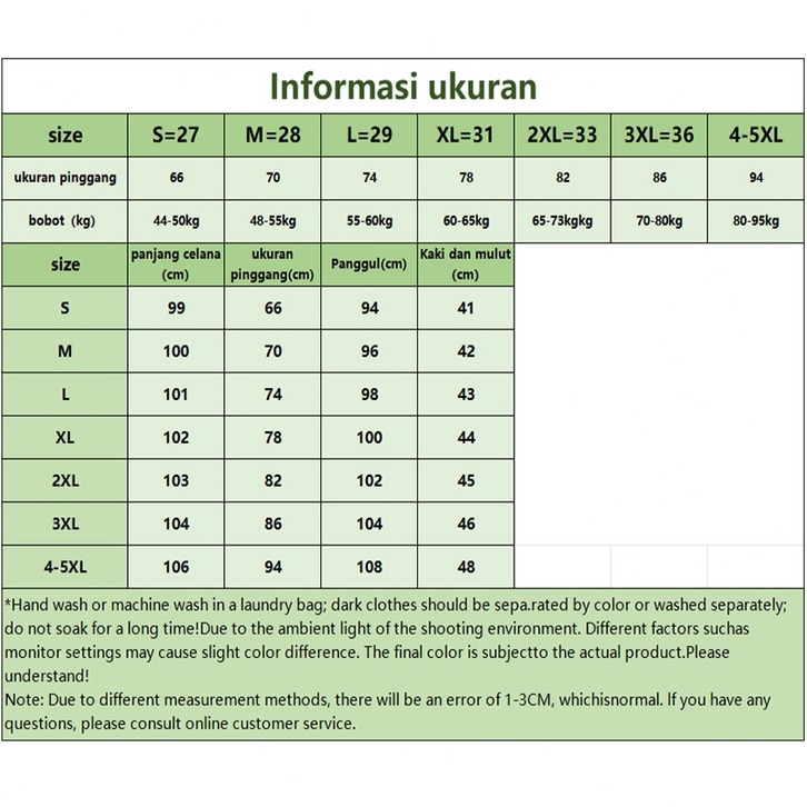 S=27(44-50kg) , M=28(48-55kg) , L=29(55-60kg), XL=31(60-65kg), 2XL=33(65-73kg), 3XL=36(70-80kg) , 4-5XL=38(80-95kg)