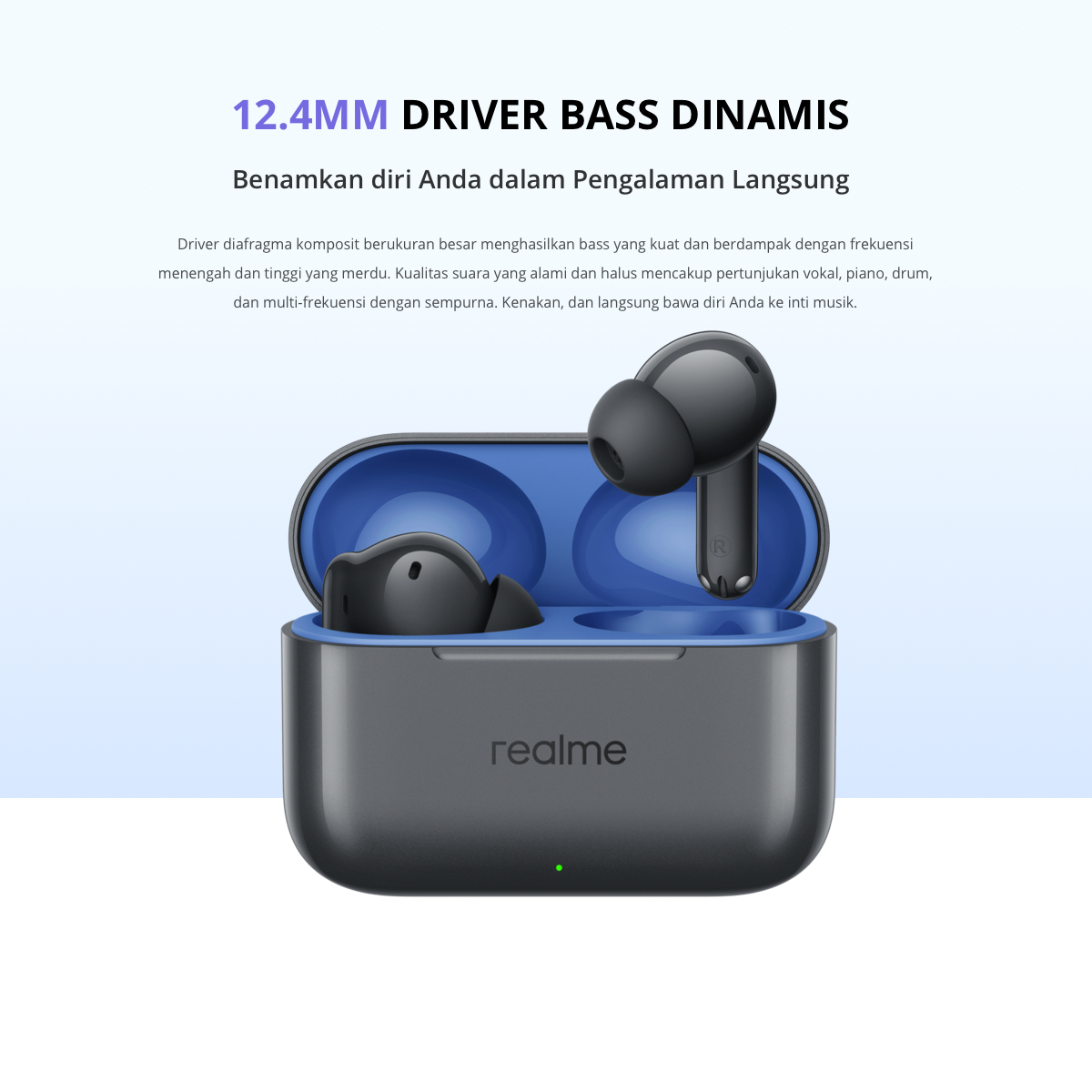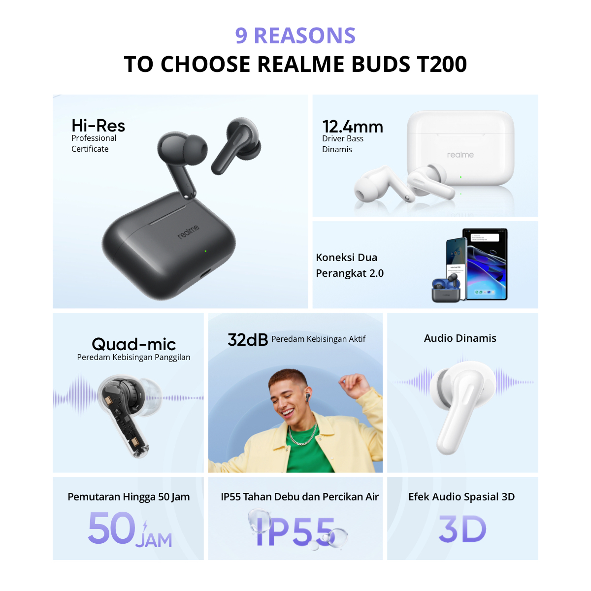 REALME T200 (BASS DRIVER DINAMIS 12.4MM | PEREDAM KEBISINGAN 32DB | PEMUTARAN HINGGA 50 JAM)