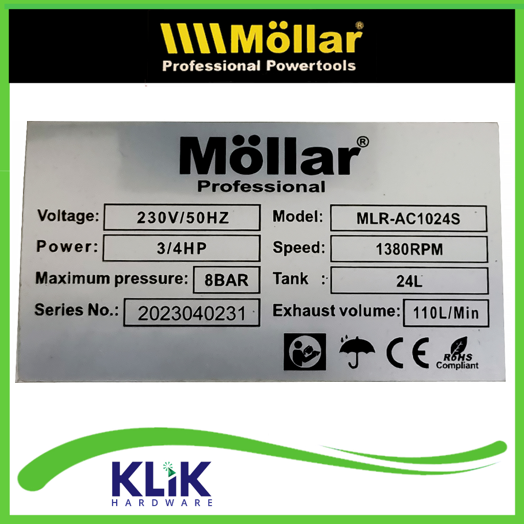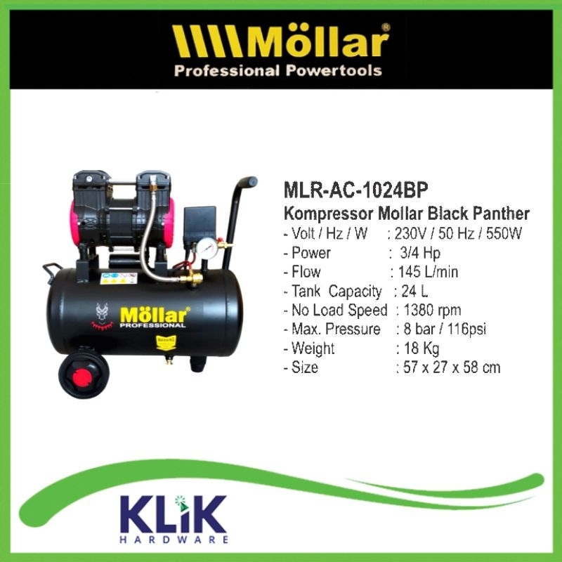 MOLLAR Kompresor Oil Less Silent 3/4 HP 24 Liter Oilless 550 Watt 1024S