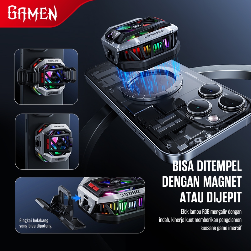 GAMEN Siberia Evo Fan Cooler Hp Gaming Magnetic RGB Light Up to -4°C LED Display Dengan Klip Penjepit Kipas Hp Original