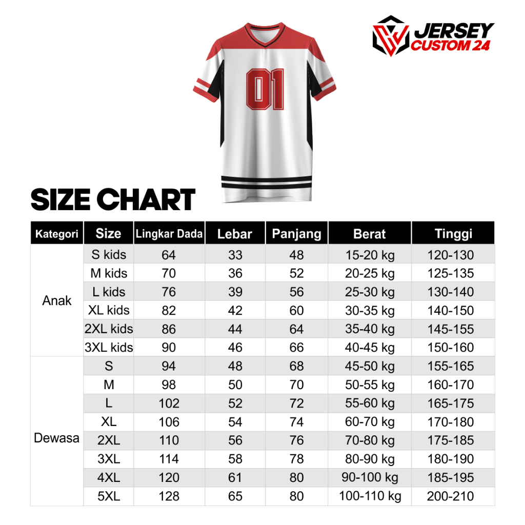 S Kids (2-3 tahun), M Kids (4-5 tahun), L Kids (6-8 tahun), XL Kids (9-11 tahun), 2XL Kids (12 tahun), S, M, L, XL, 2XL