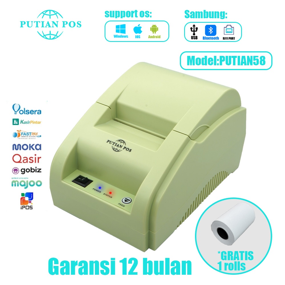 PUTIAN POS Desktop 58mm Printer Termal Bluetooth Mendukung Port USB RJ11