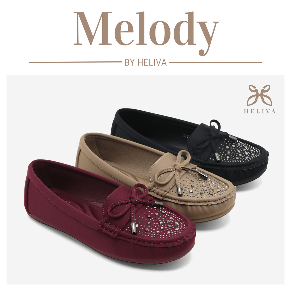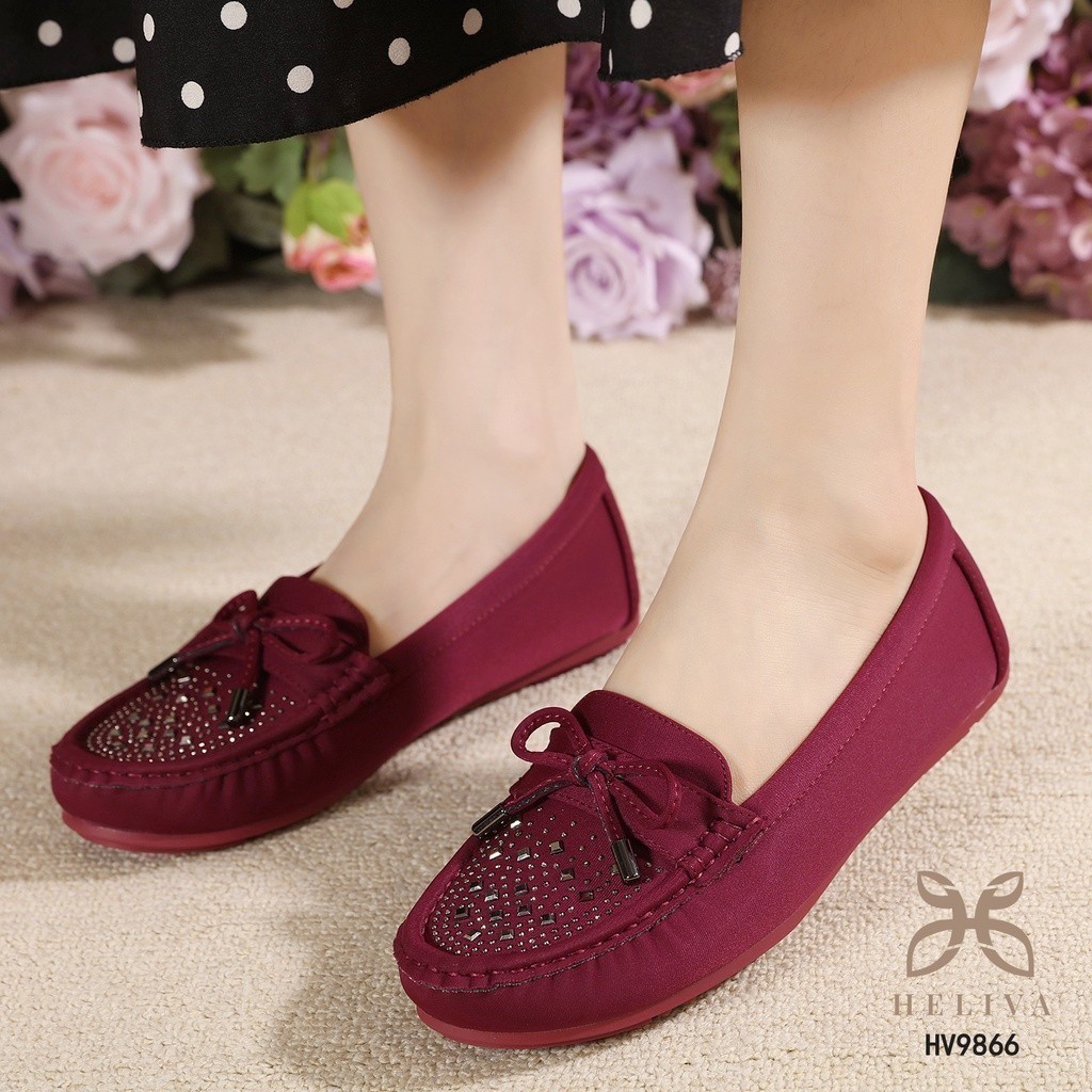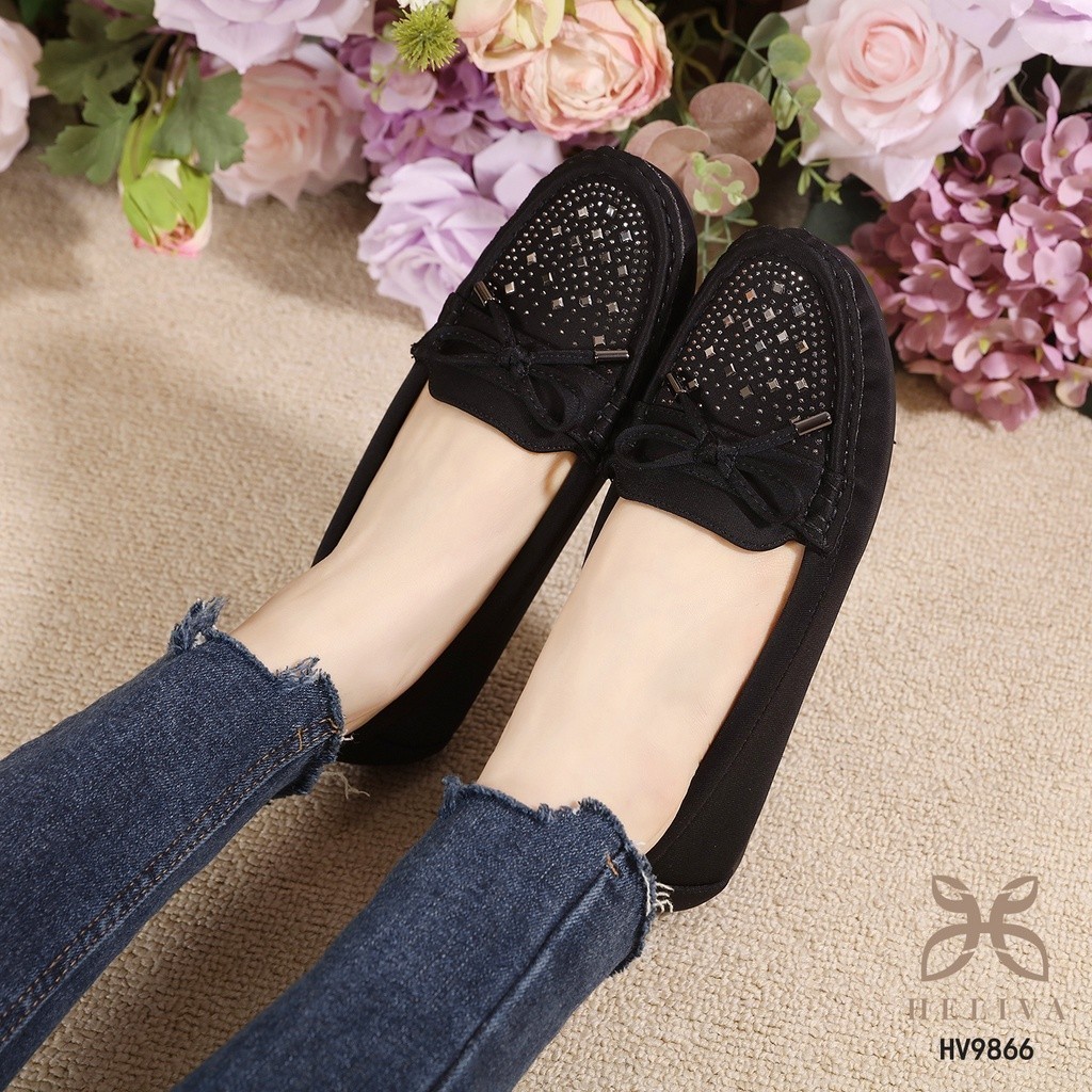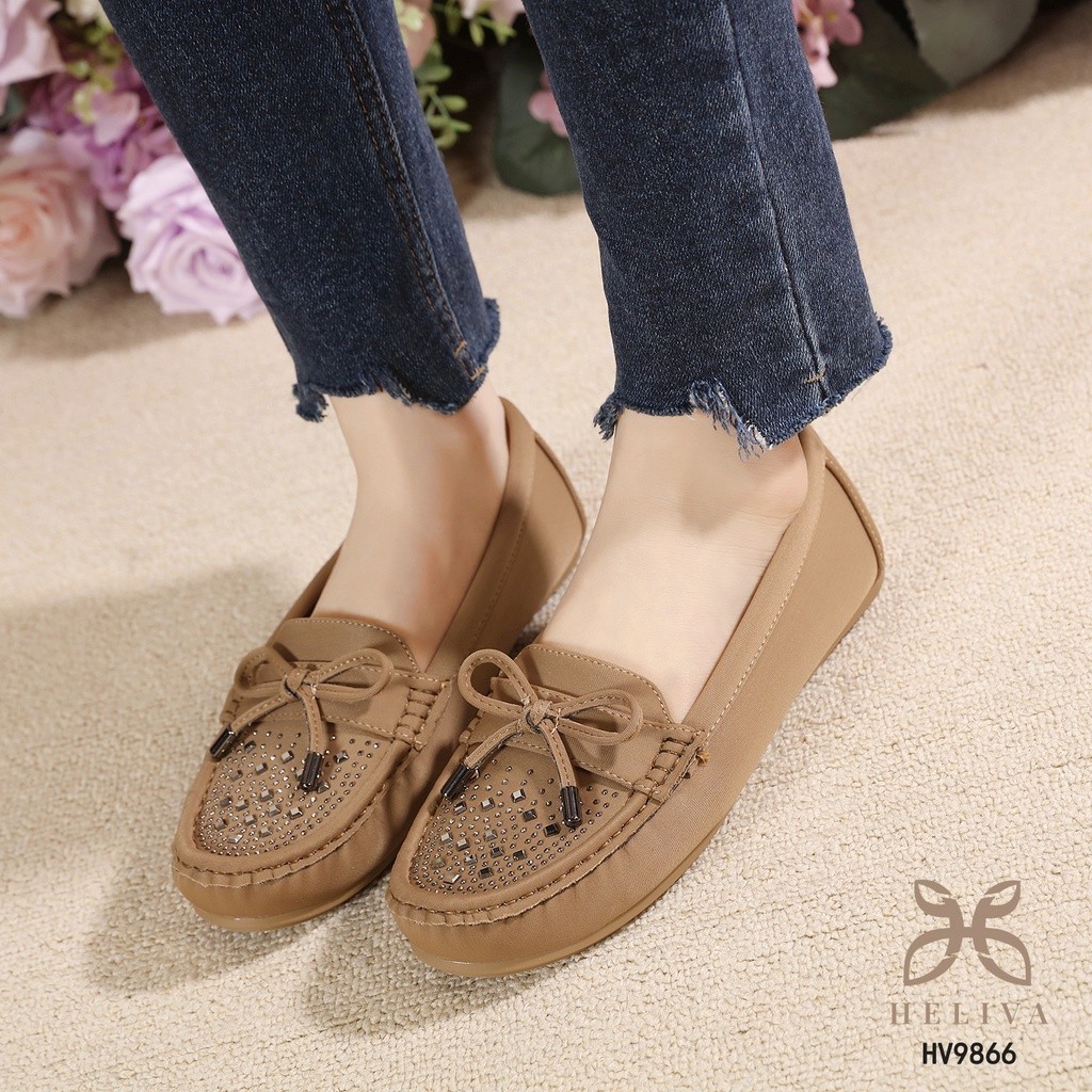 Heliva Melody Loafers Wanita Bahan Kulit Halus Studded Timbul Pita Kecil Empuk HV9866
