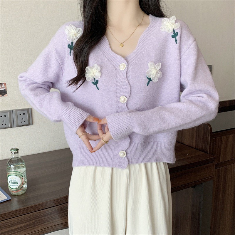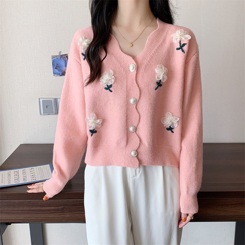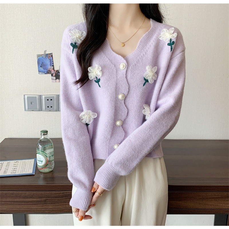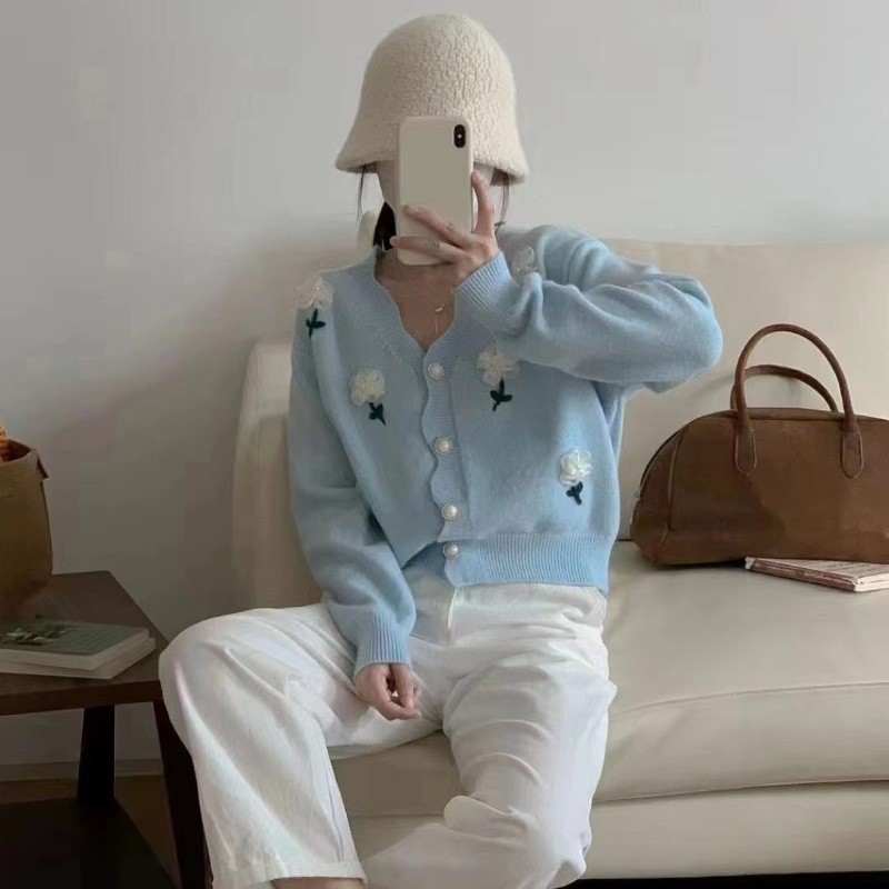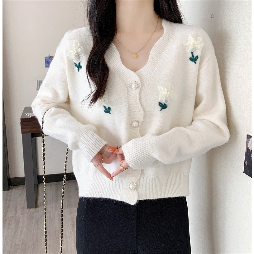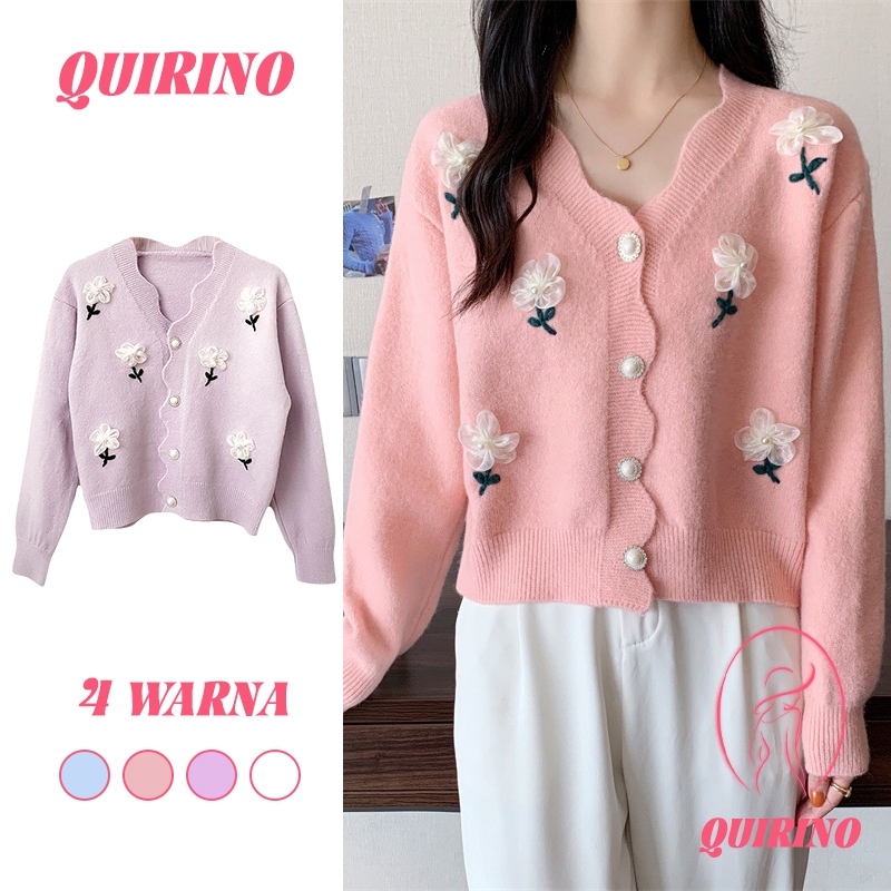 QUIRINO - CARDIGAN WOL GAYA KOREA RAJUTAN TULIP PUTIH 3D LONGGAR LEHER BULAT BUNGA POLOS KERAH V