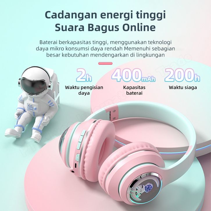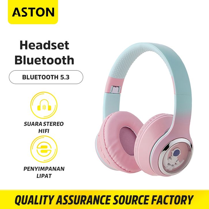 Headset Bluetooth ASTON Headphone Wireless Bluetooth 5.3 AT-TW163 Cute makaron For TF card HIFI Noise Cancelling Asli