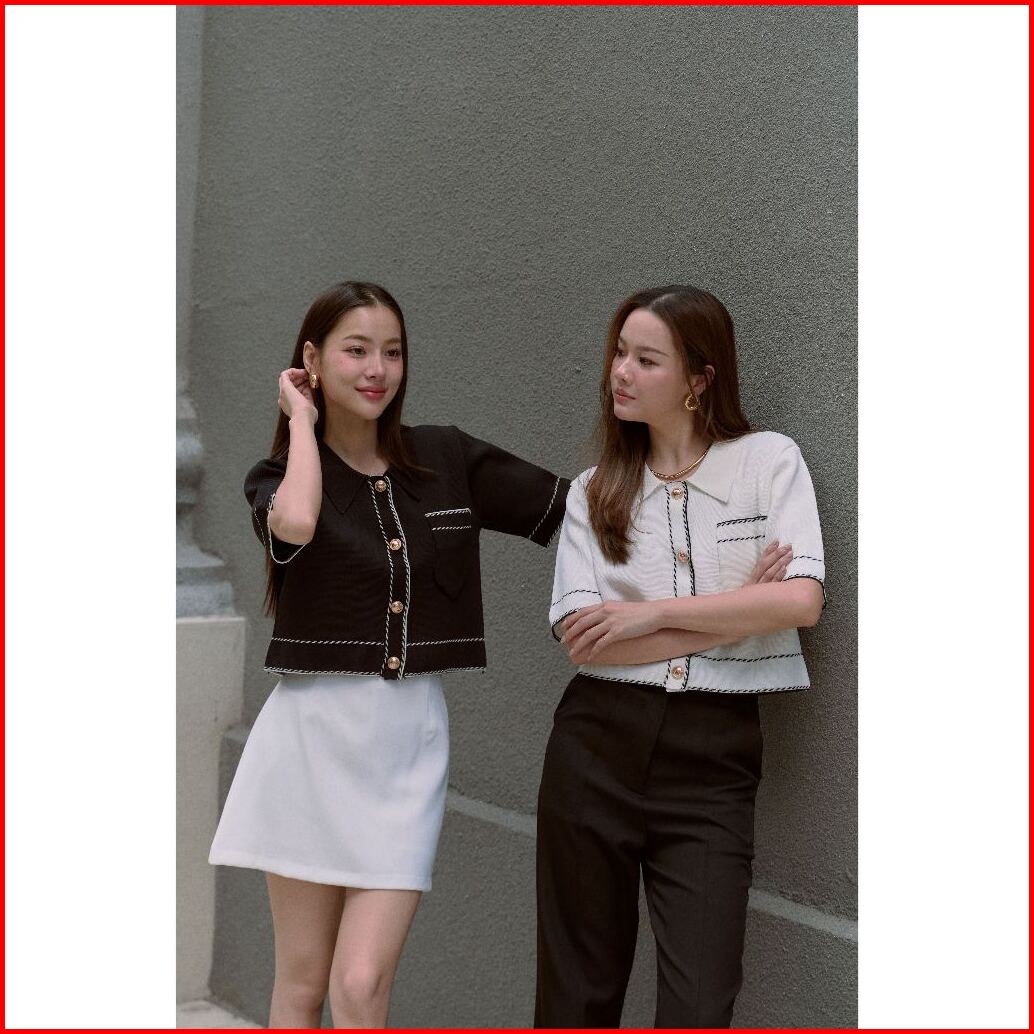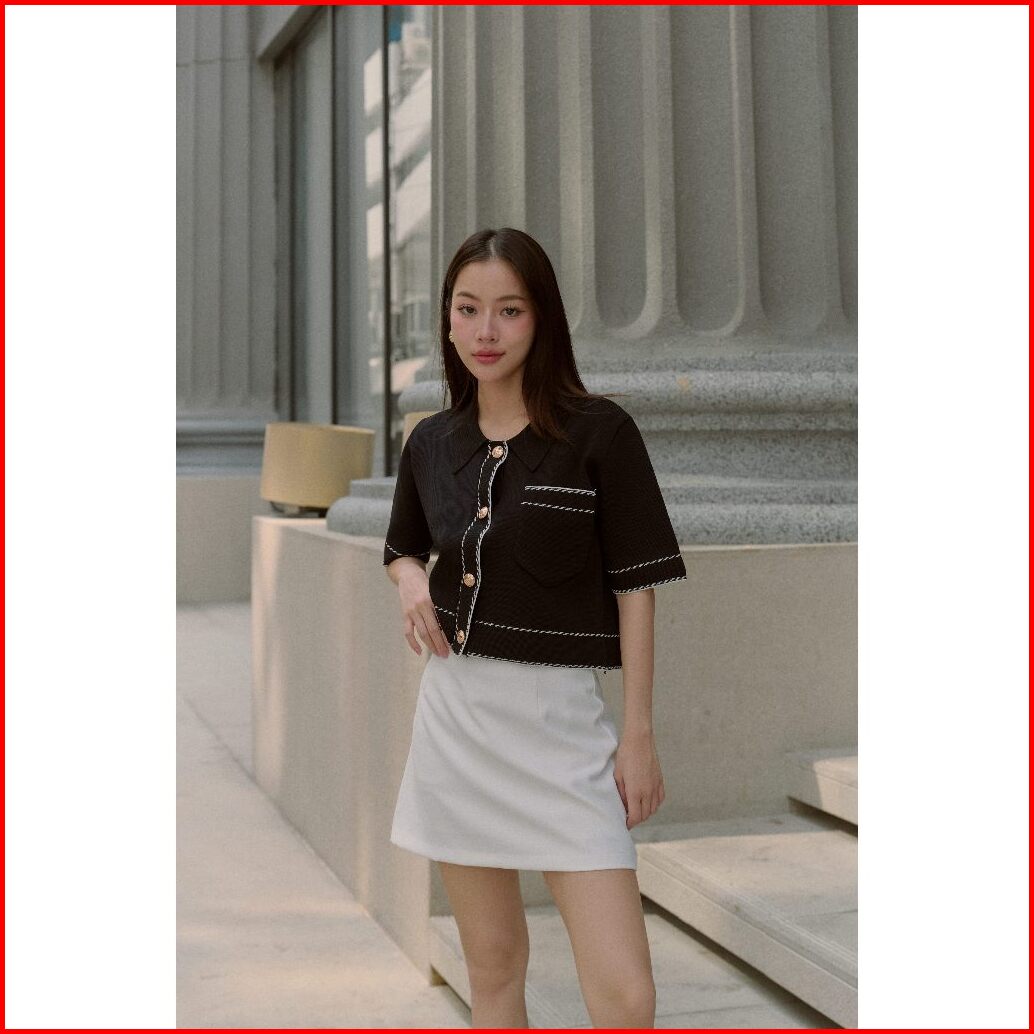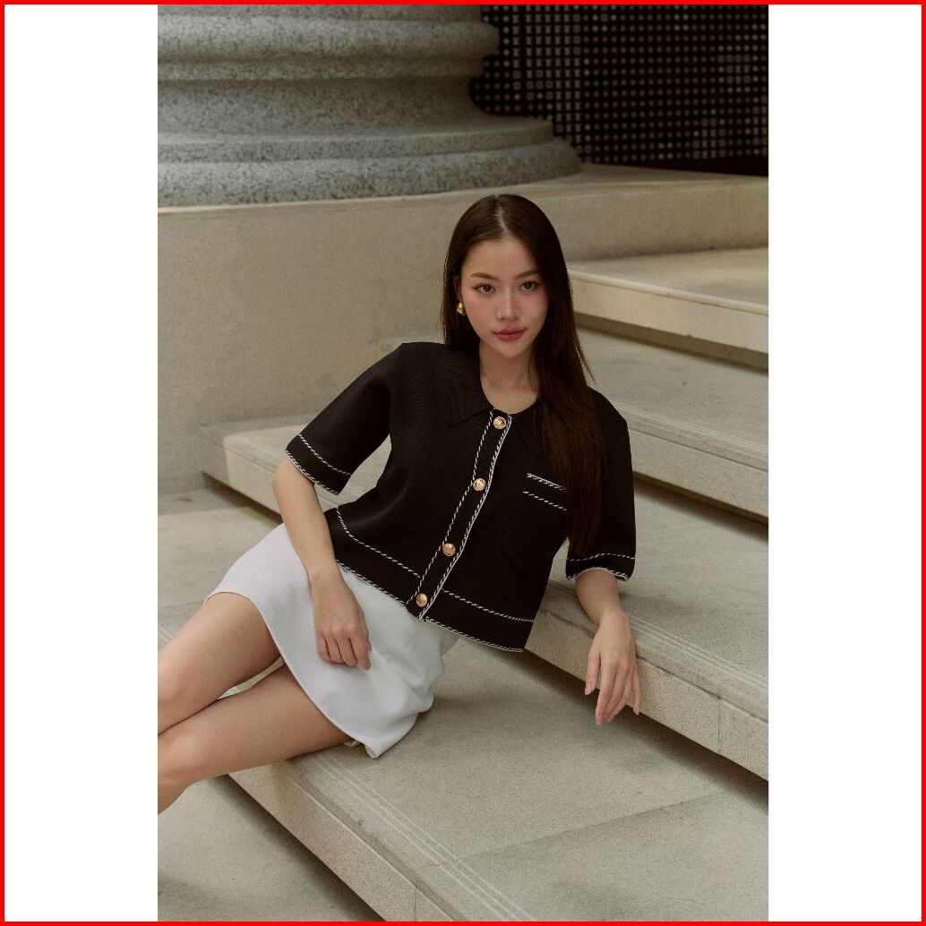 Kiyorawears - U - A Vier Knit Contrast Top Atasan Lengan Pendek Casual Blouse Button Shirt Atasan Unik Wanita Baju Atasa
