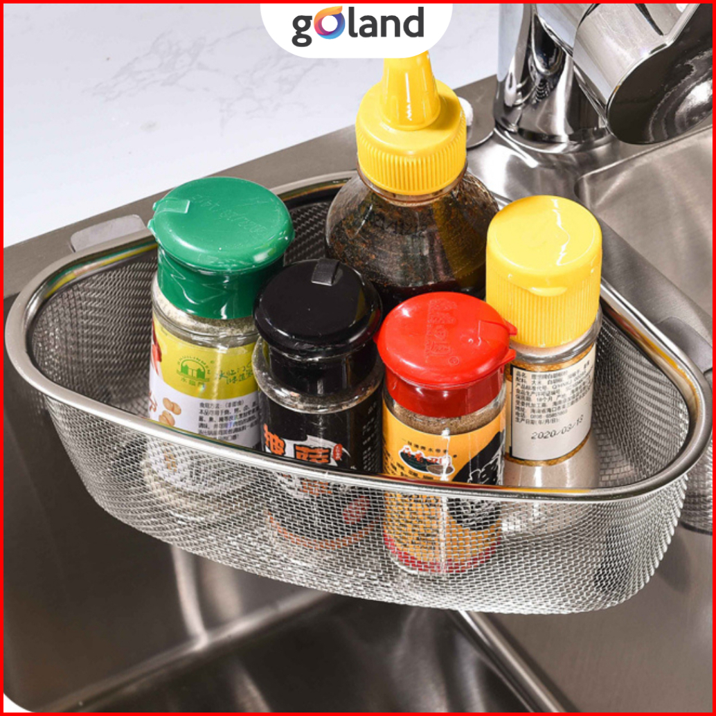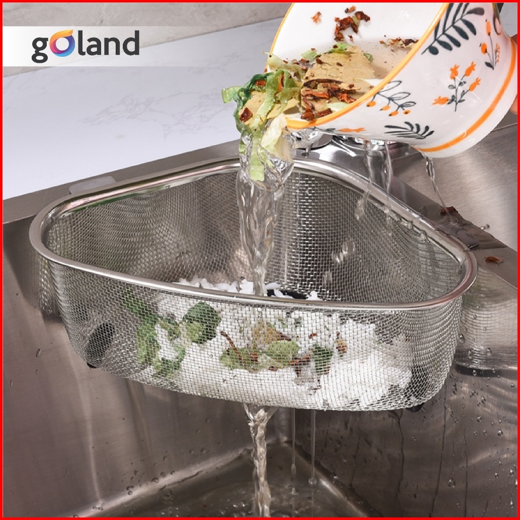 Goland Rak Saringan Sudut Wastafel Segitiga Cuci Piring Stainless Tempat Spon Sabun Cuci Piring Dapur Multifungsi