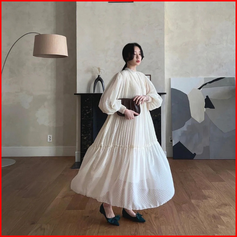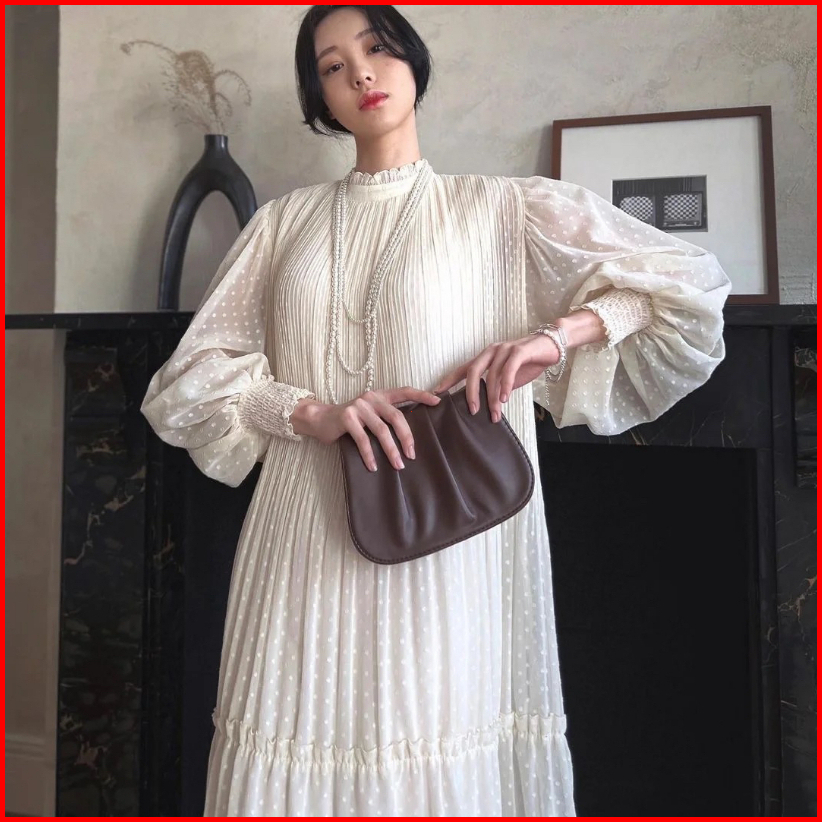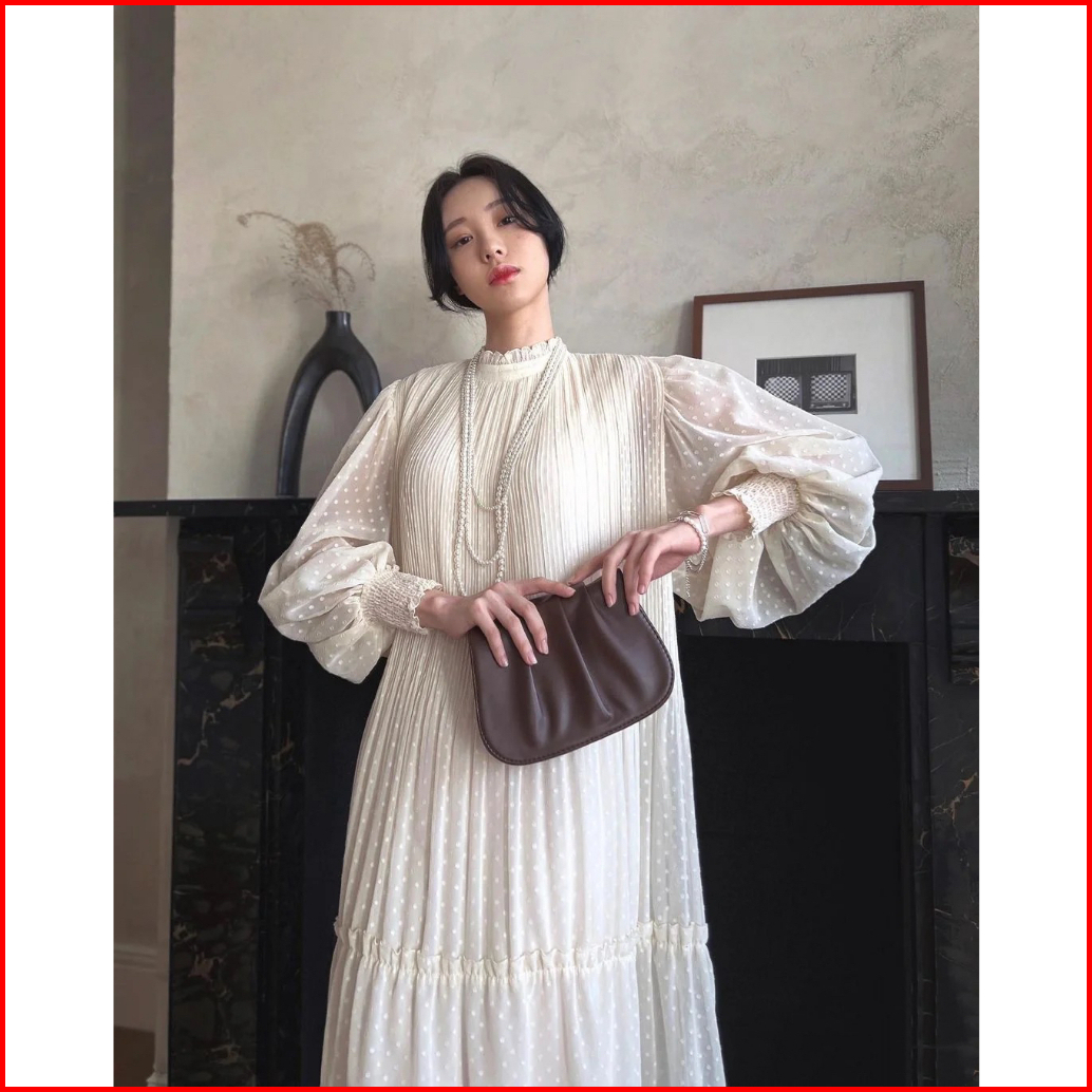 Gaun Panjang Gaun Polka Dot Lengan Lentera Sedikit Berlipat Kerah Berdiri Untuk Wanita Dress Korean Style Princess M650