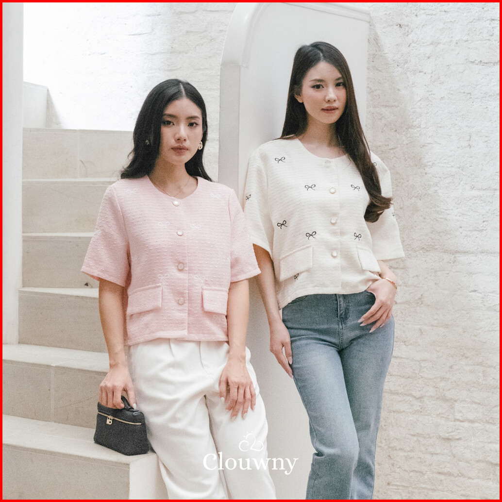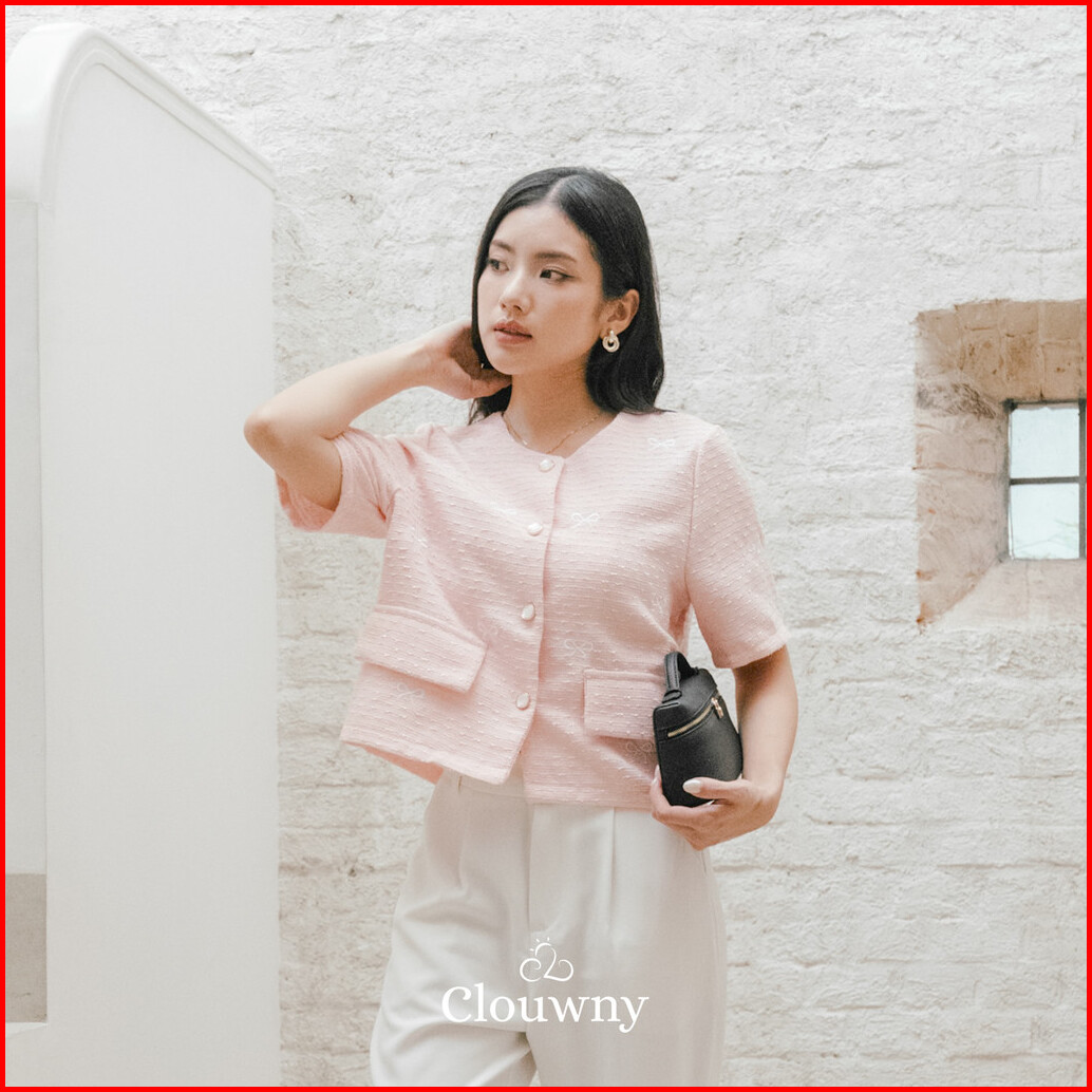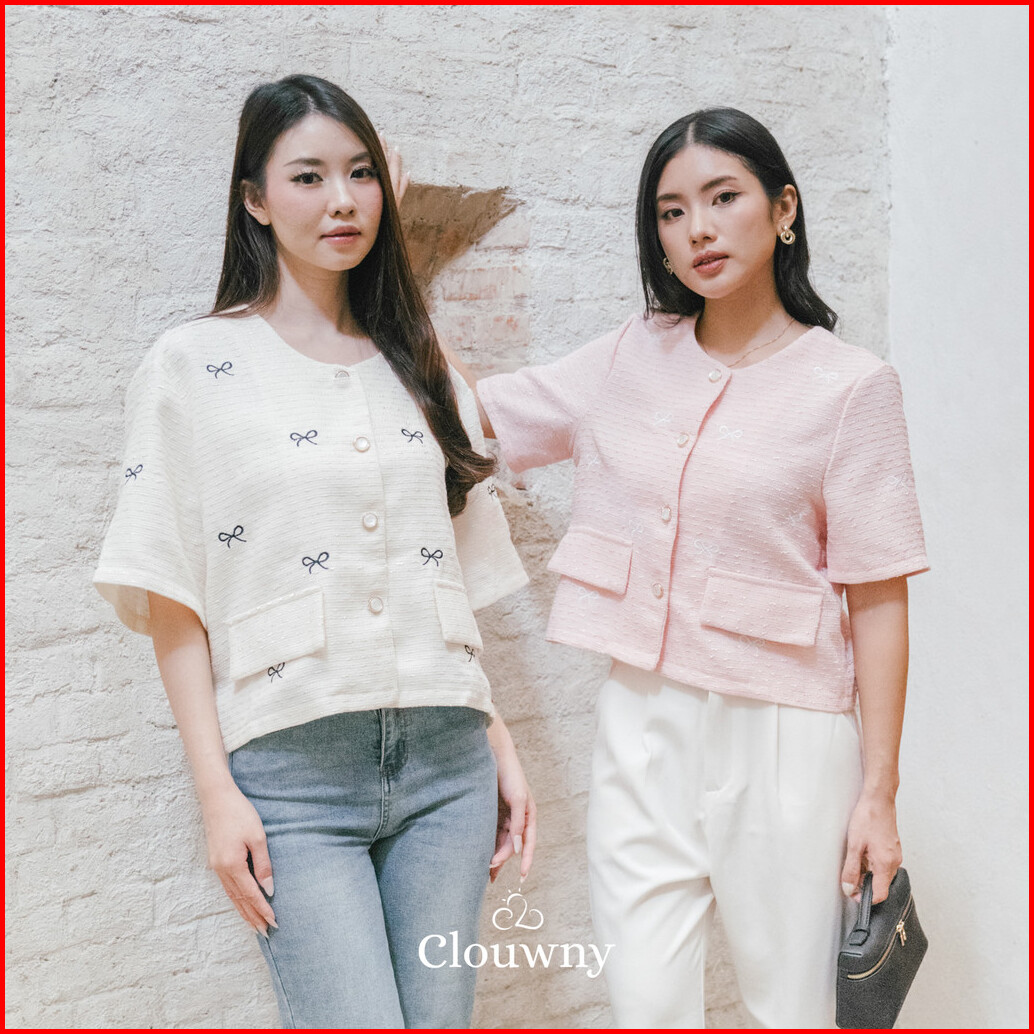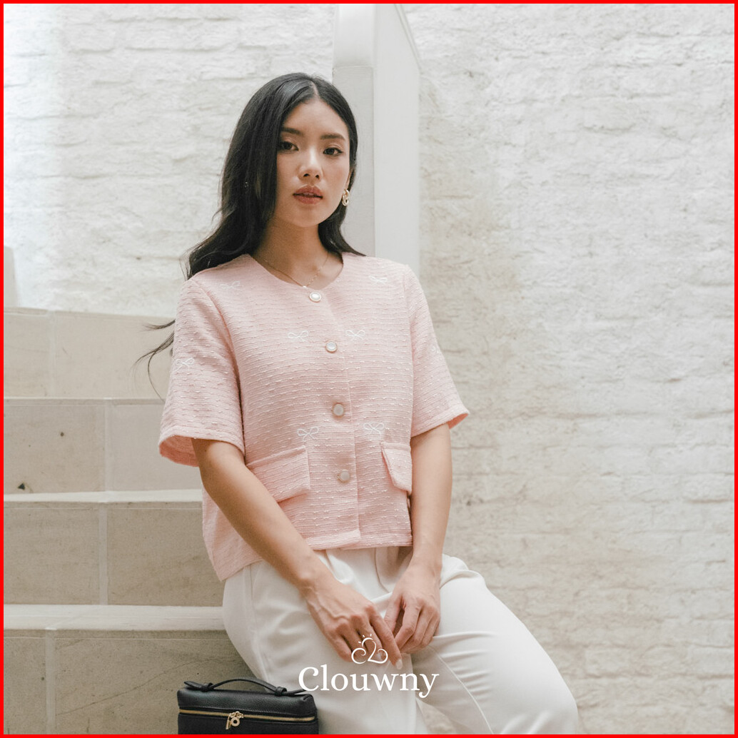 Clouwny Emery Ribbon Tweed Top Atasan Wanita Modern Klasik Elegan Premium Tweed Korean Look Fit To Xxl