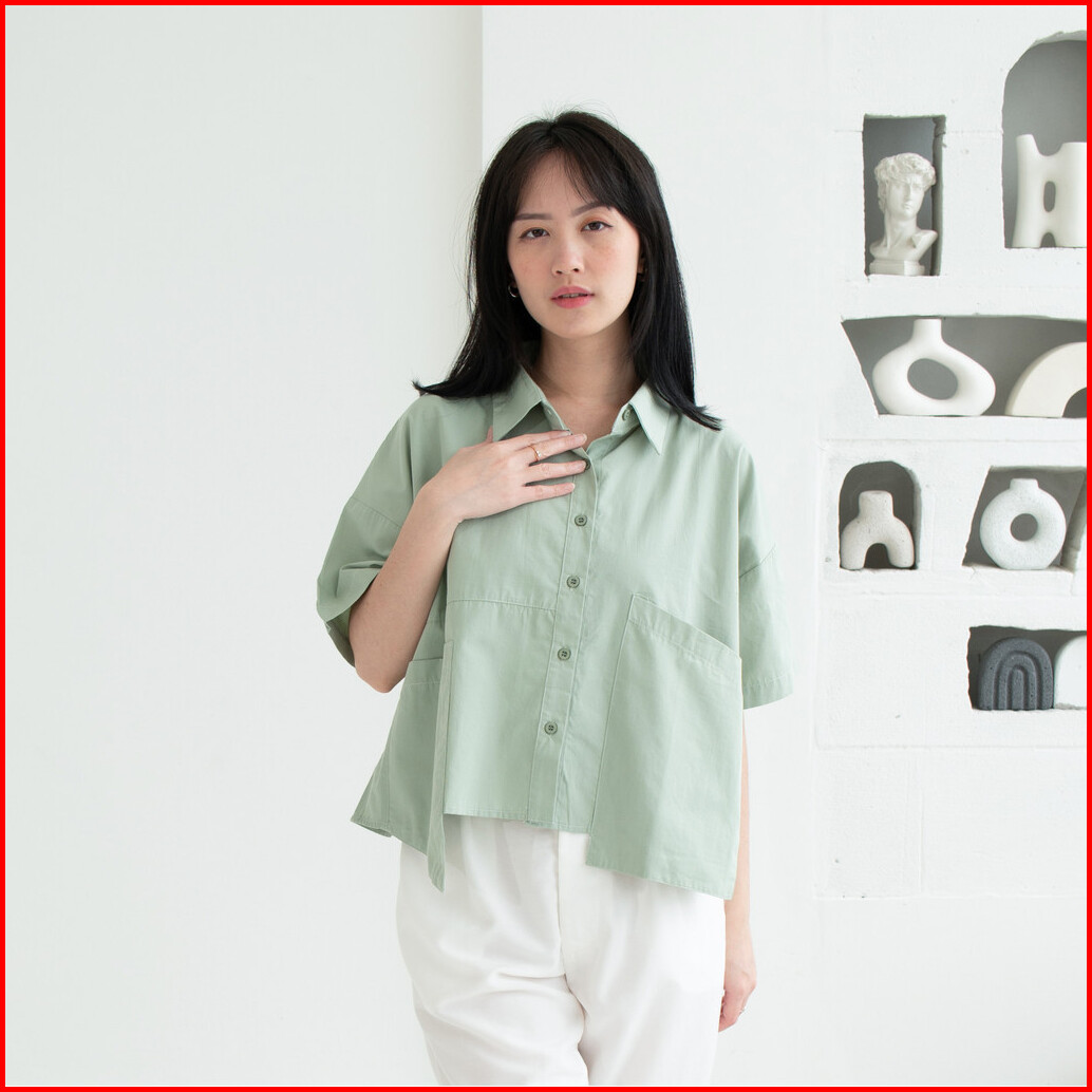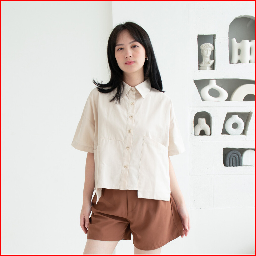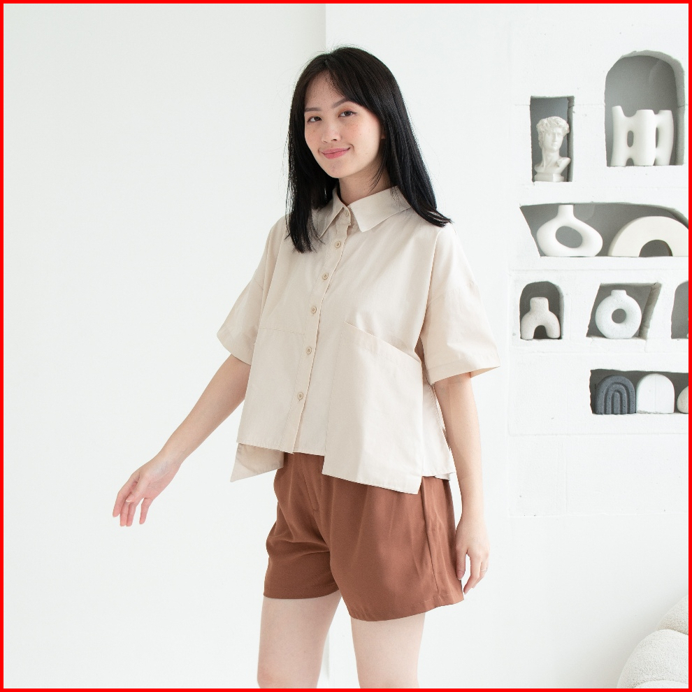 Queentin Kemeja Wanita Asimetris 0662 Katun Poplin Polos Lengan Pendek