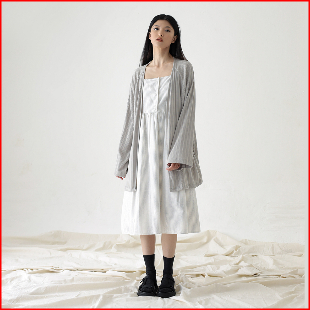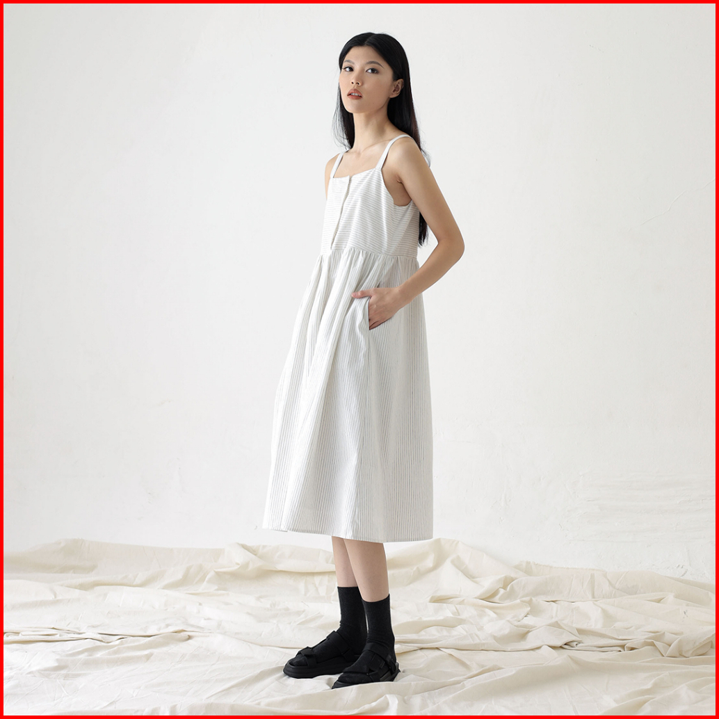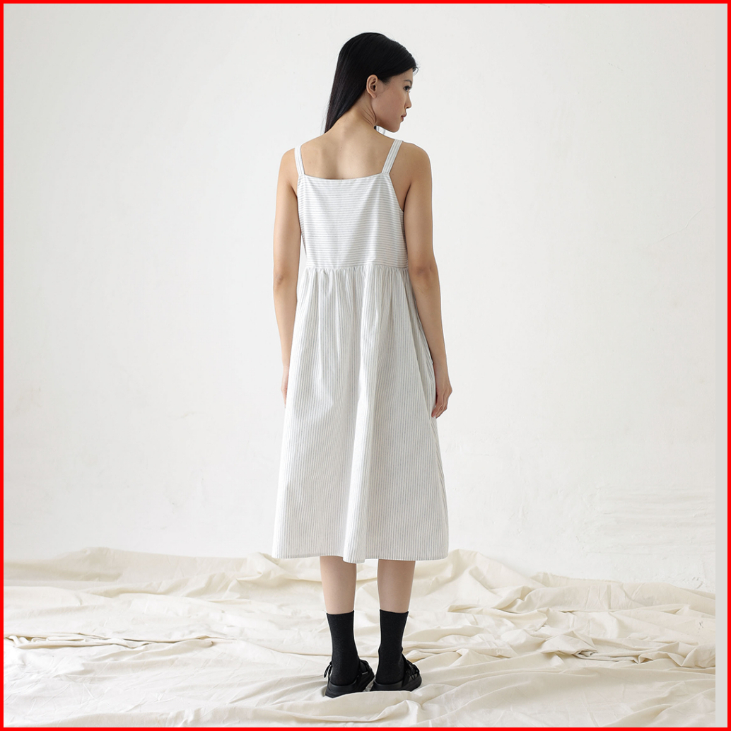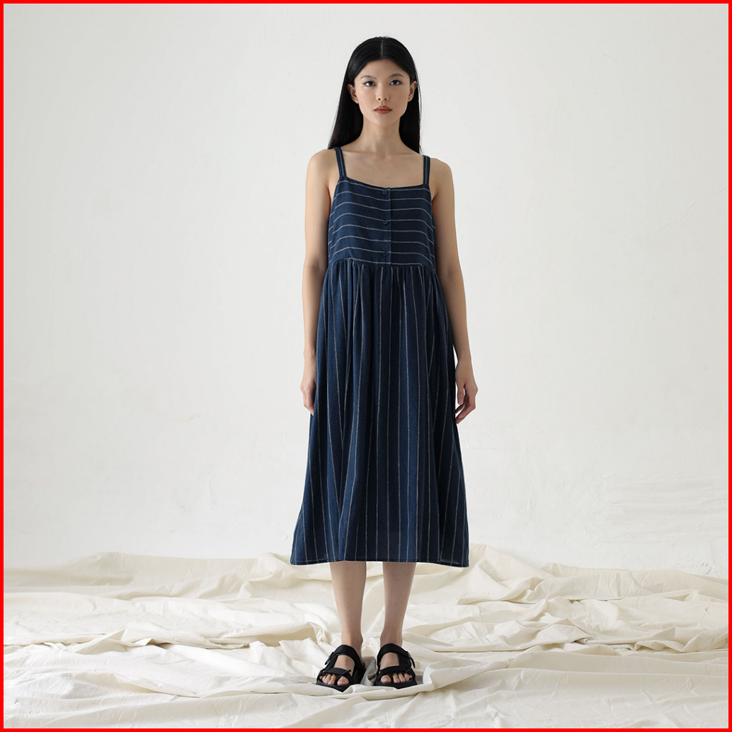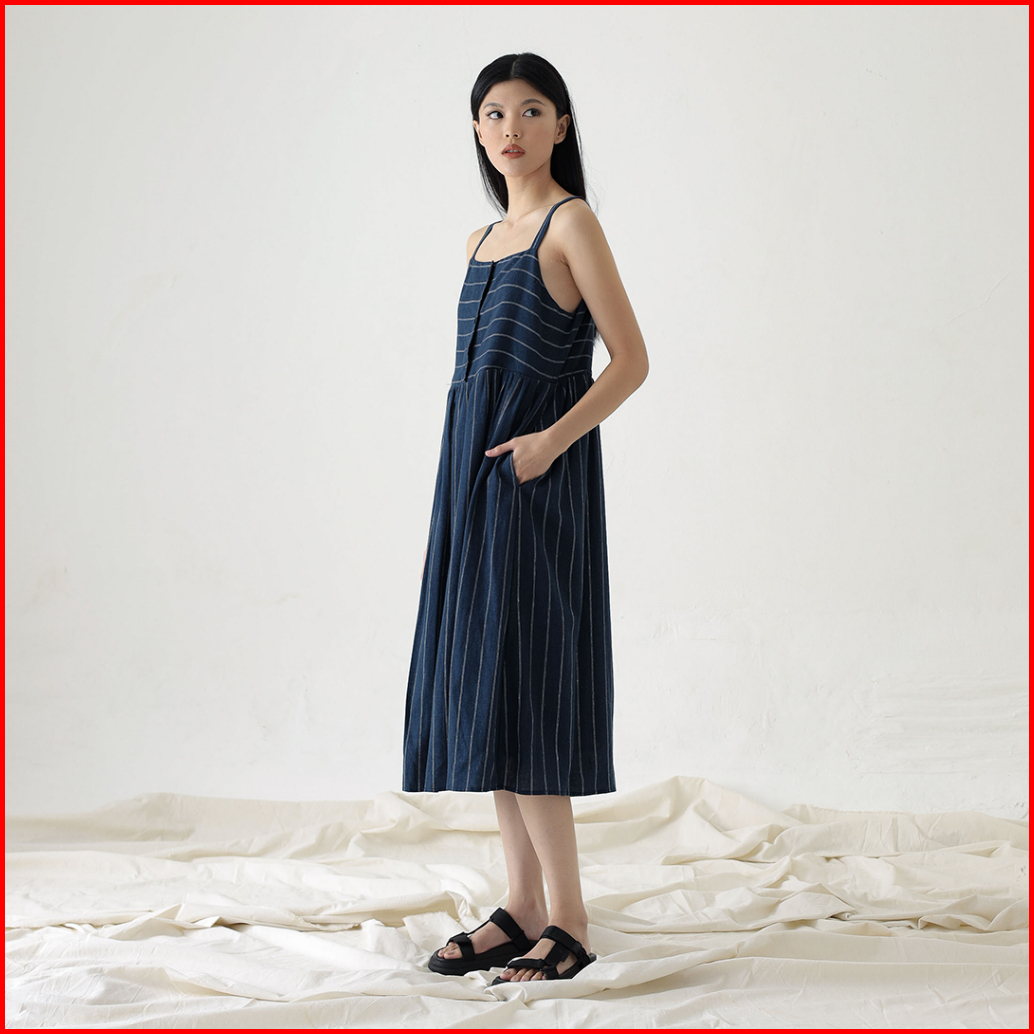 Inkano Linen Dress - Sleeveless Dress Linen Dress Wanita Midi Dengan Kancing Depan Warna Offwhite Stripes Dan Navy Strie