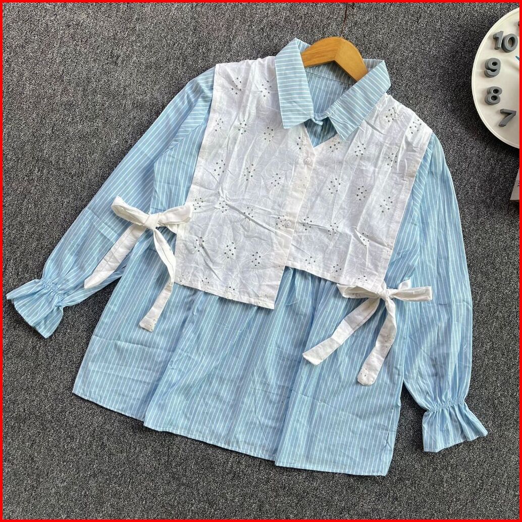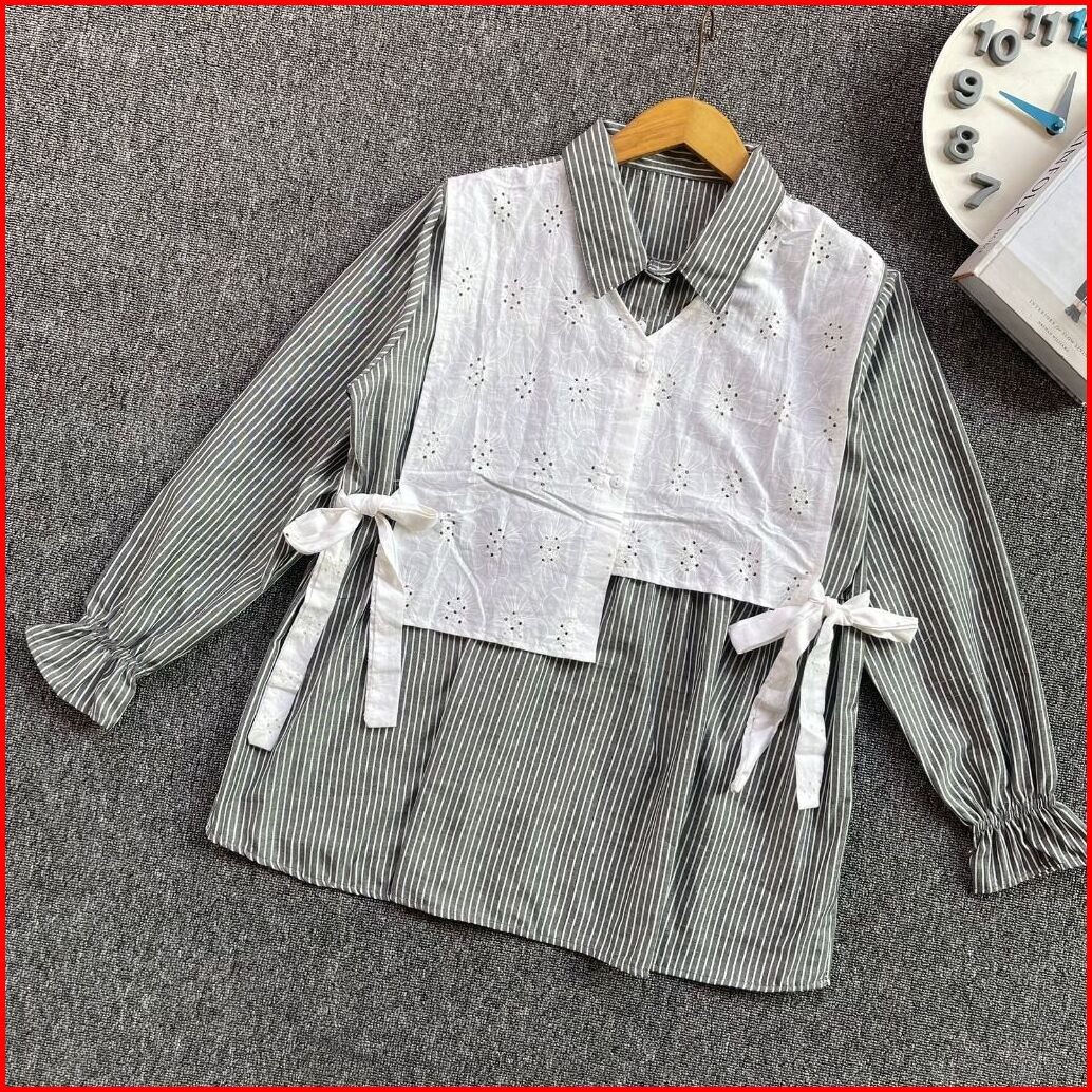Kemeja Stripe Cotton Kombinasi Brukat Kemeja Salur Kombinasi Arumi Blouse Lengan Panjang Wanita