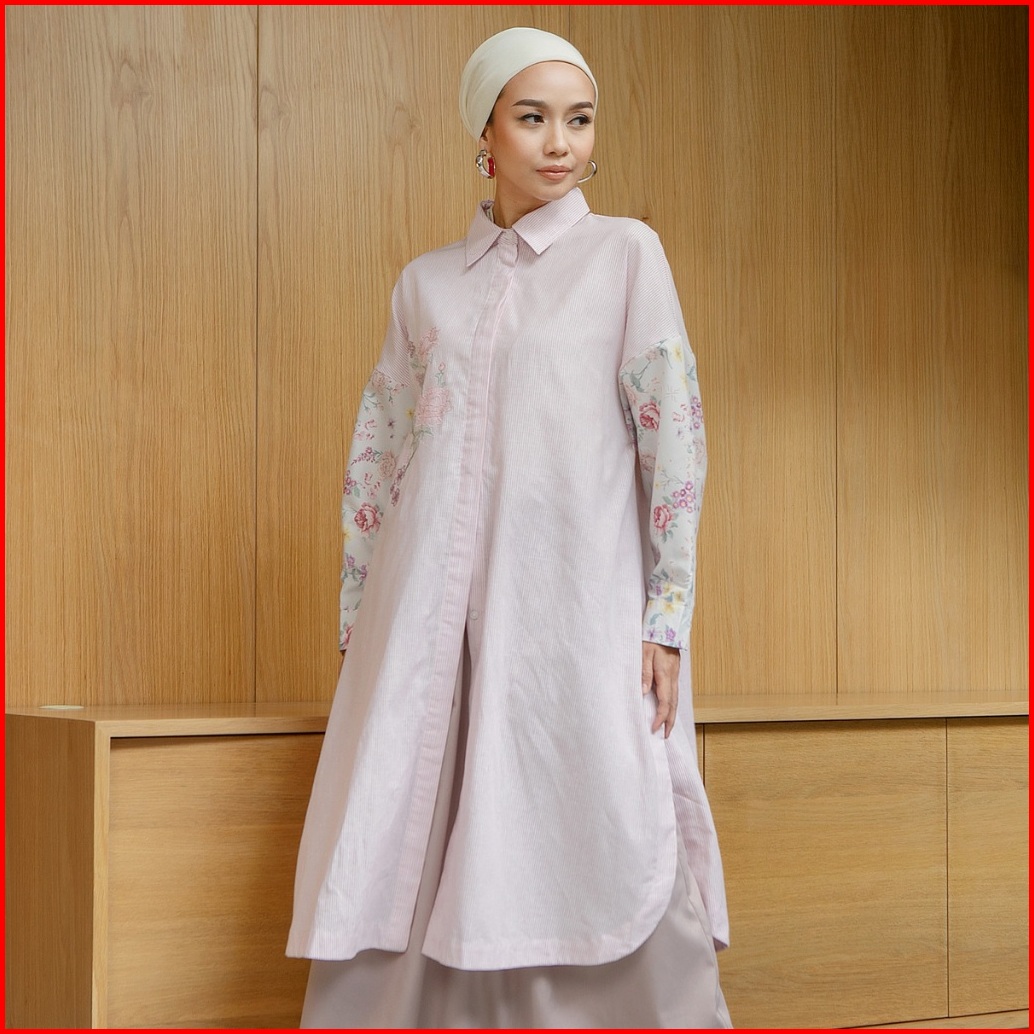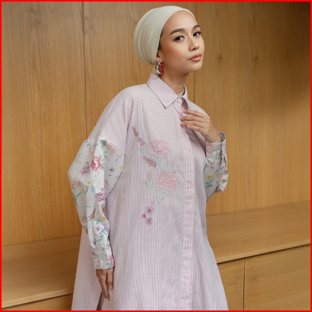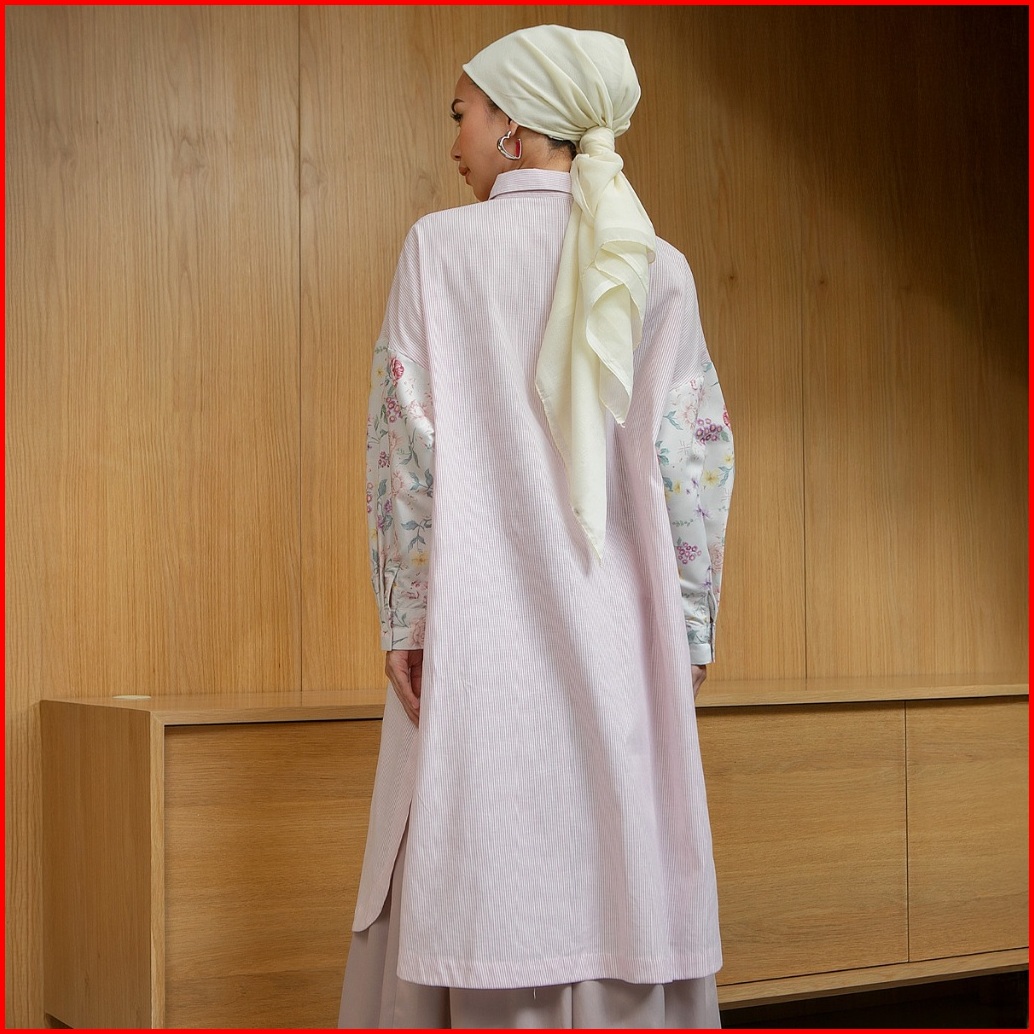 Hijabchic Giuli Pale Pink Tunic - Tunik Stripe Katun Premium Bordir Bunga Mewah Busui Friendly
