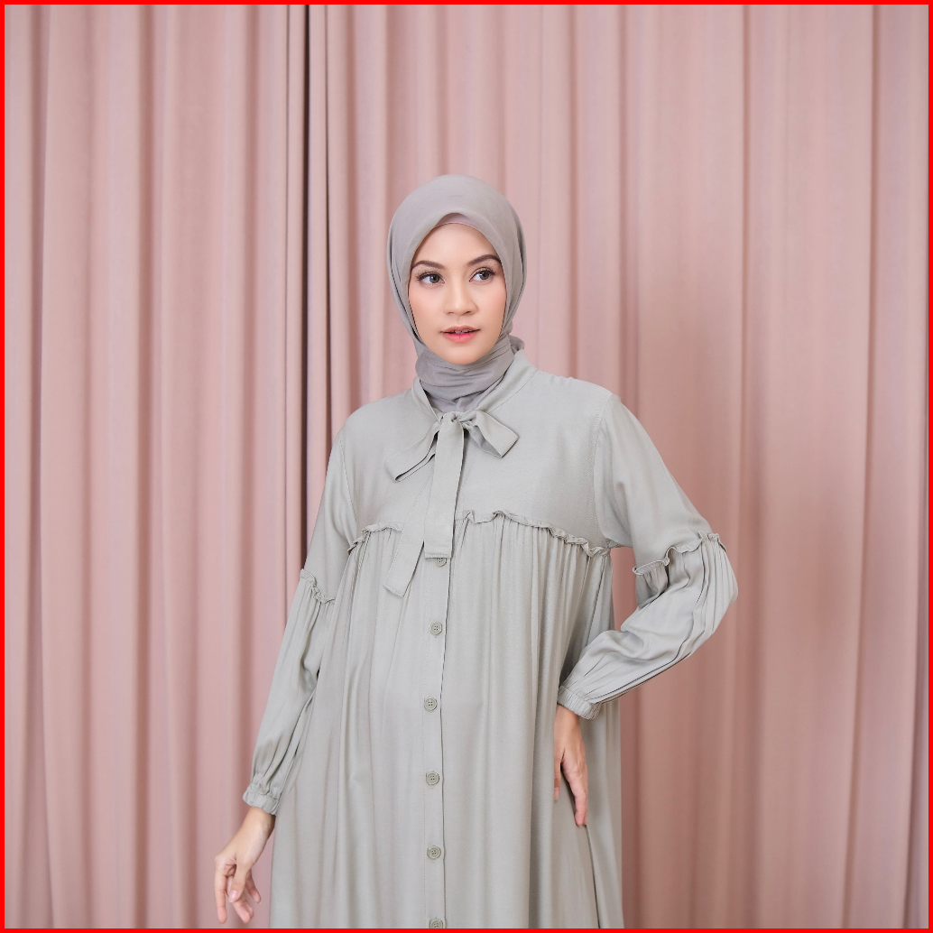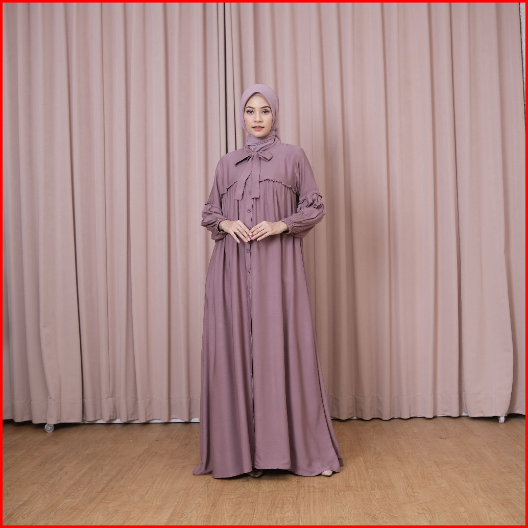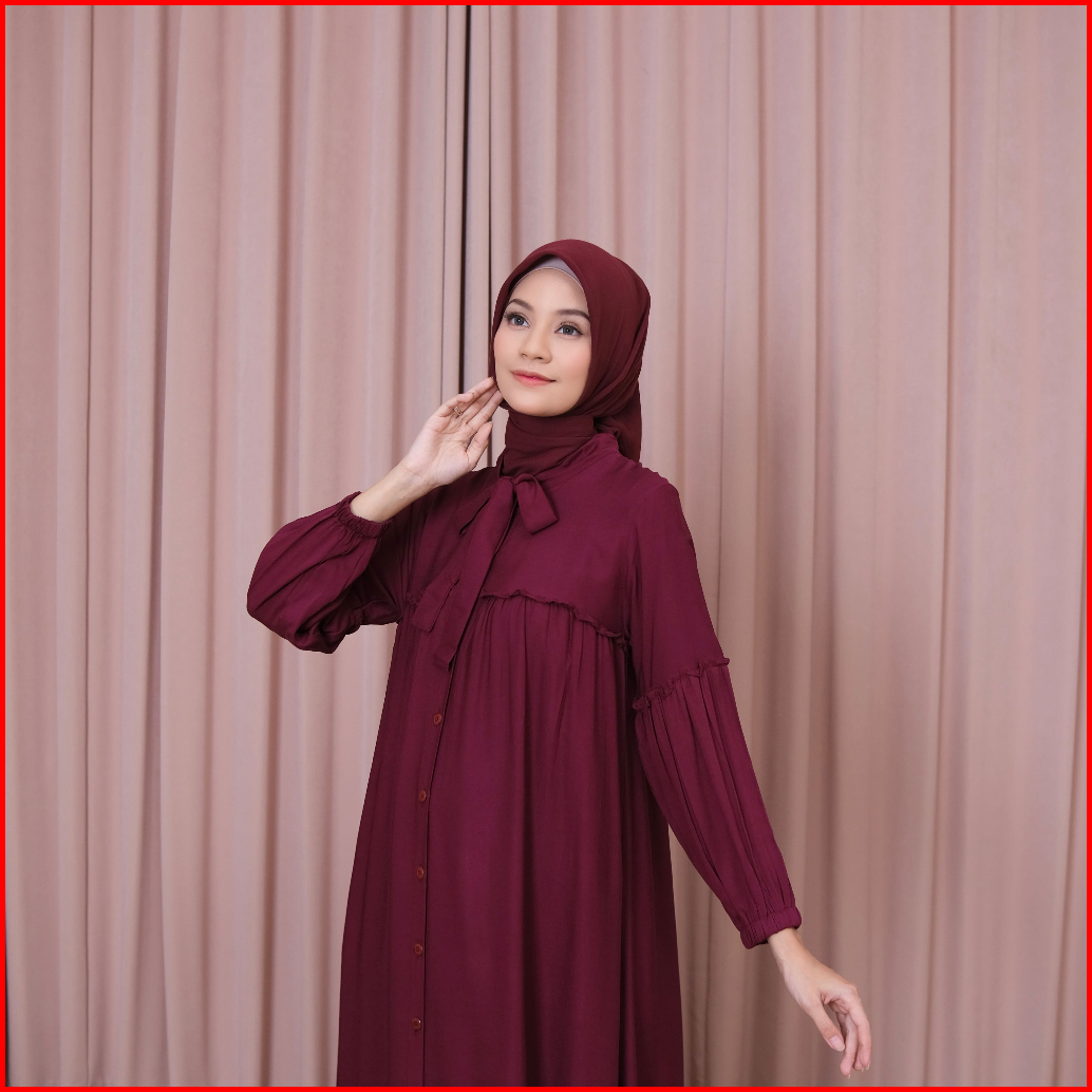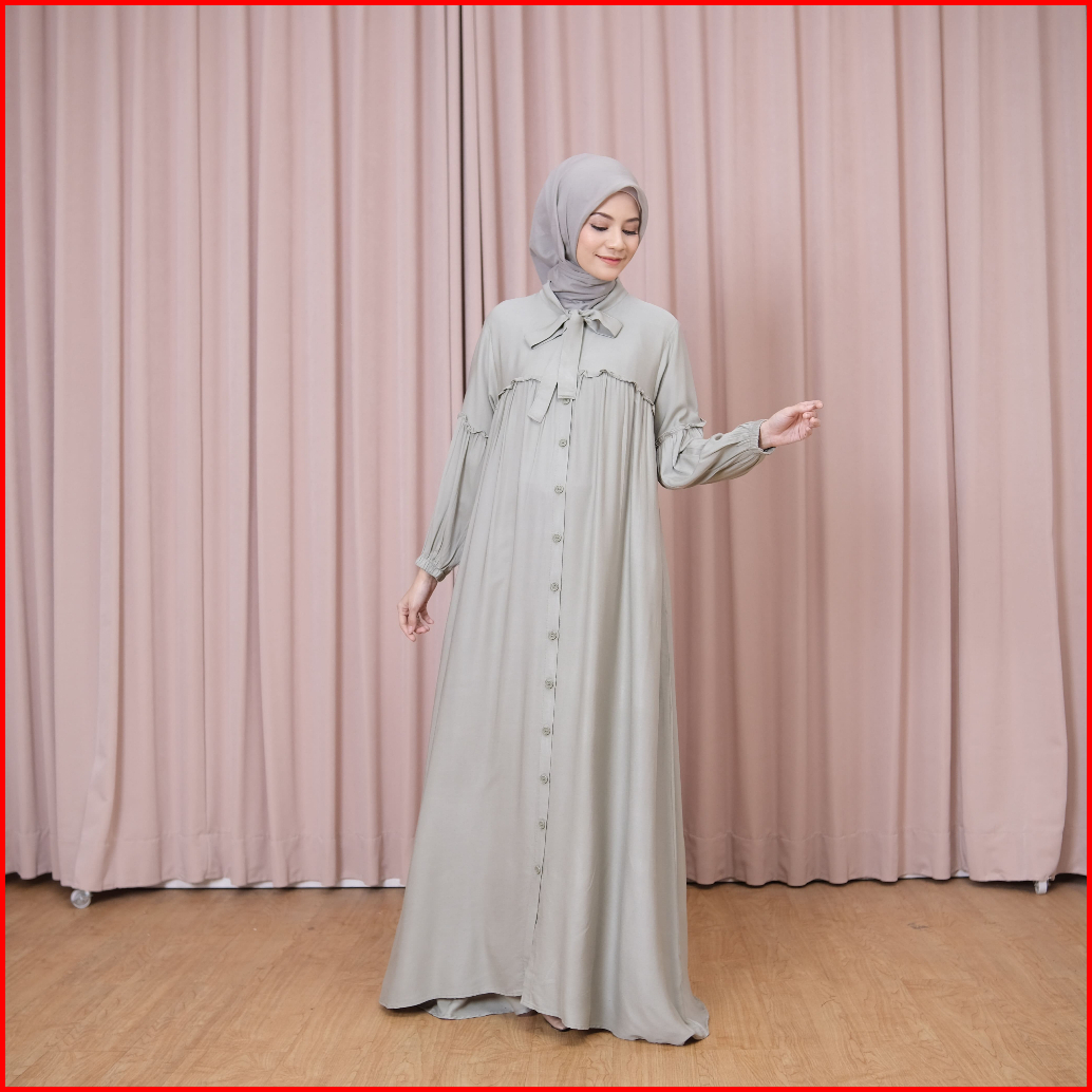 Gamis Variasi Tali Full Kancing Rayon Twill Gamis Polos Premium Muslim Wanita Gamis Lengan Karet