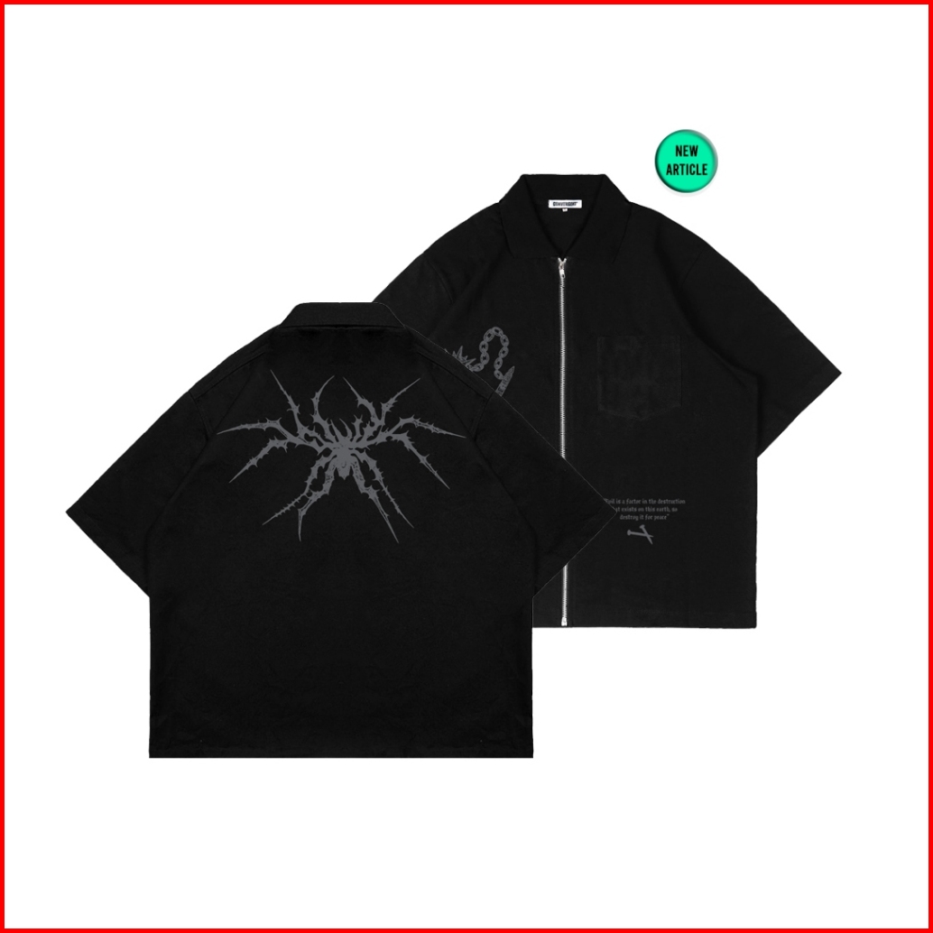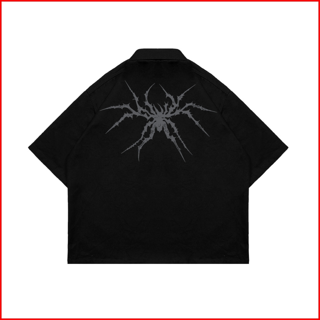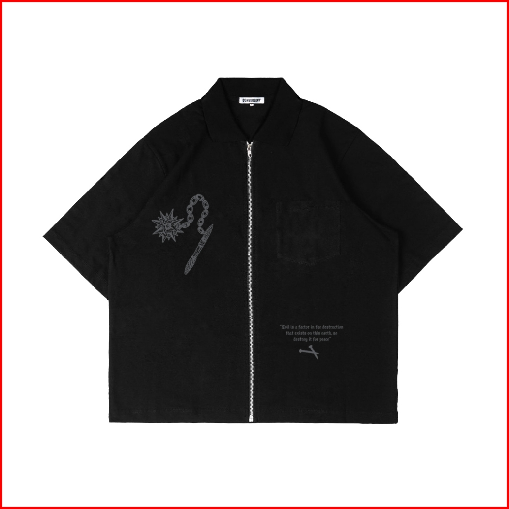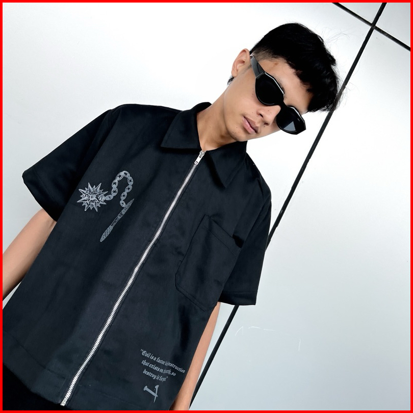 Convergent - Evil Kemeja Boxy Pria Wanita Lengan Pendek Zipper Workshirt Hitam Tebal
