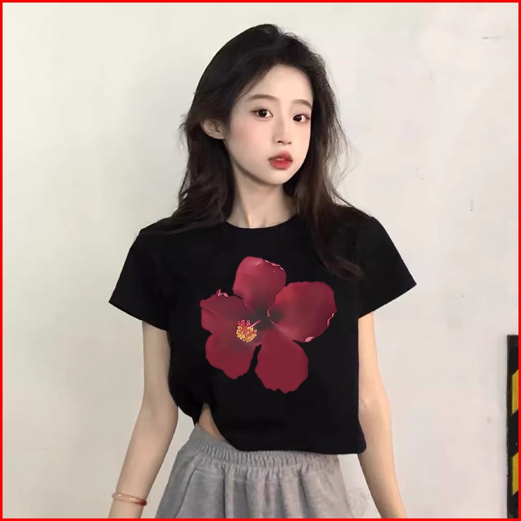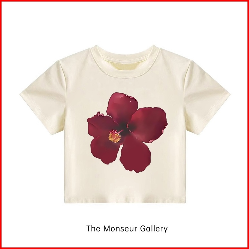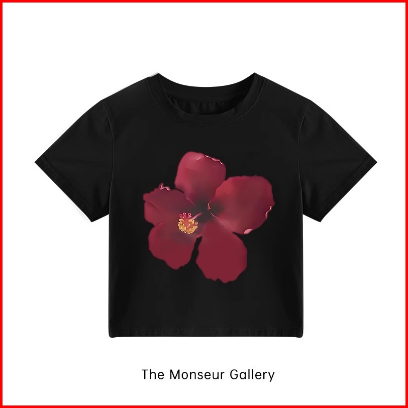 The Monseur Gallery Kaos Crop Wanita Slimfit Flower Design Hibiscus Orchid Kaos Crop Top Y2k Fashion Baju Croptee Hitam