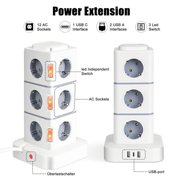 NINNE Stop Kontak Power Socket Strip Tower Colokan Listrik 2500W 3 Susun 12 Soket - NN812 - White