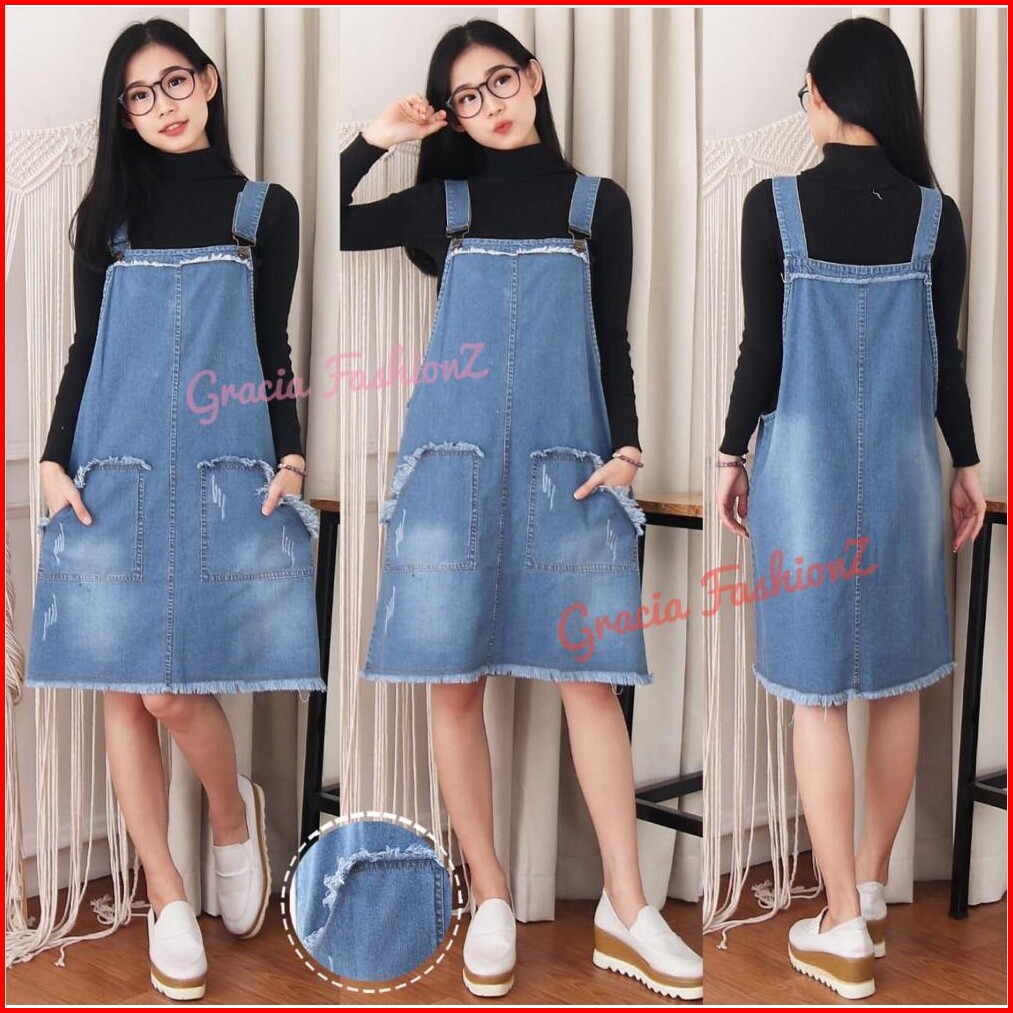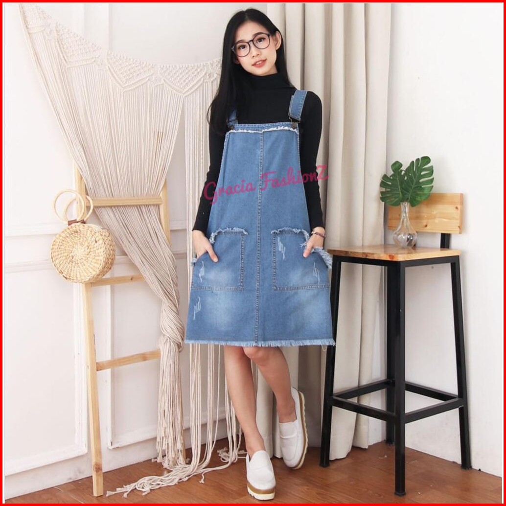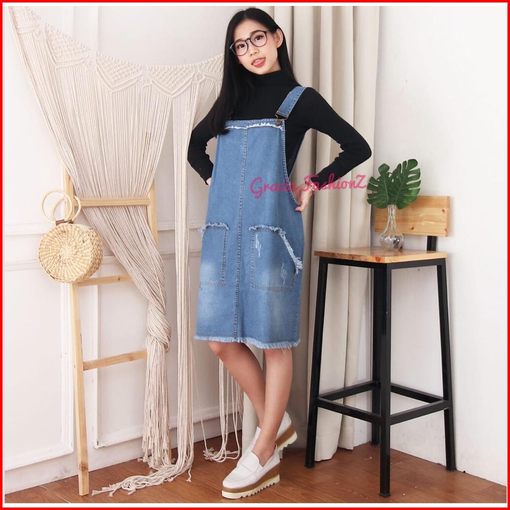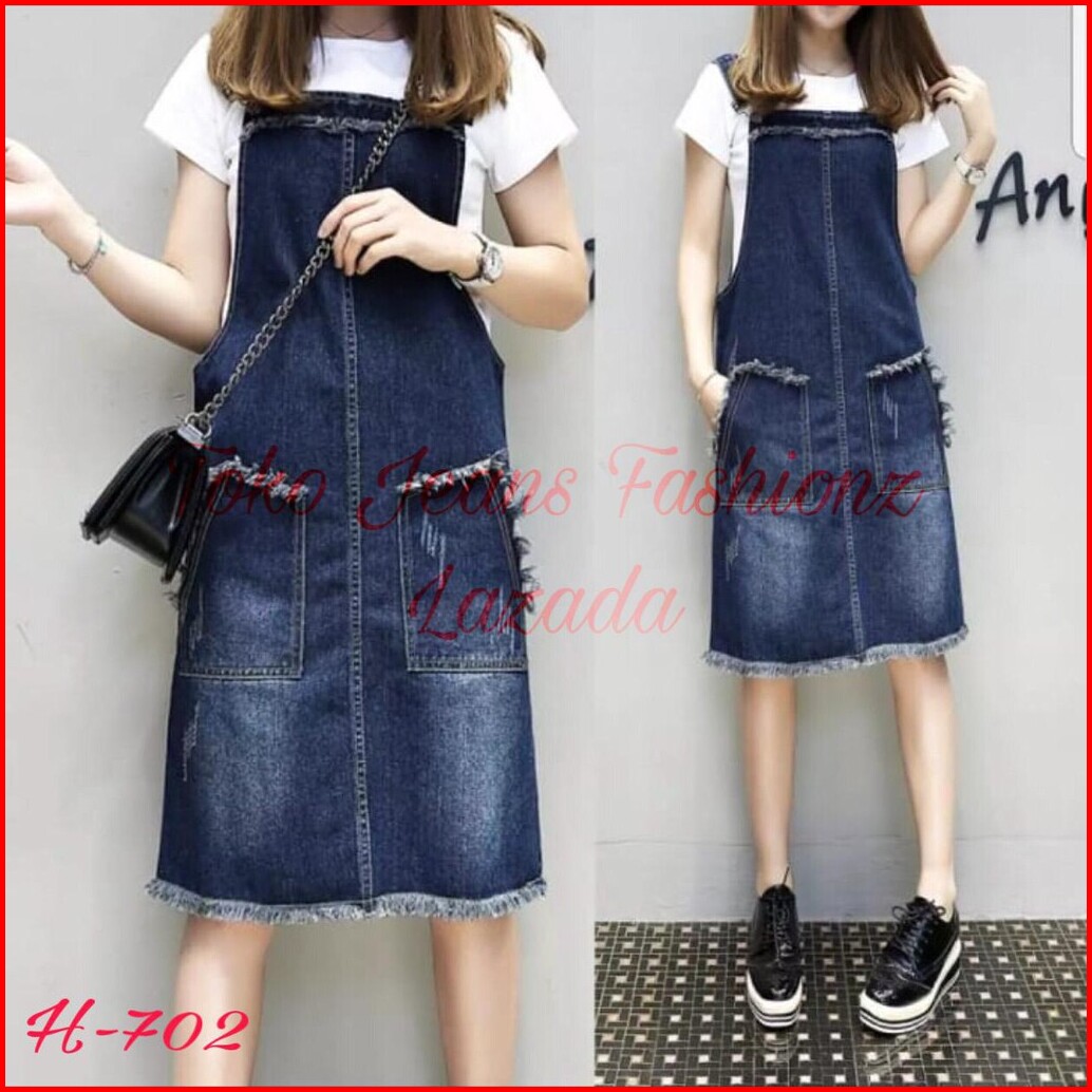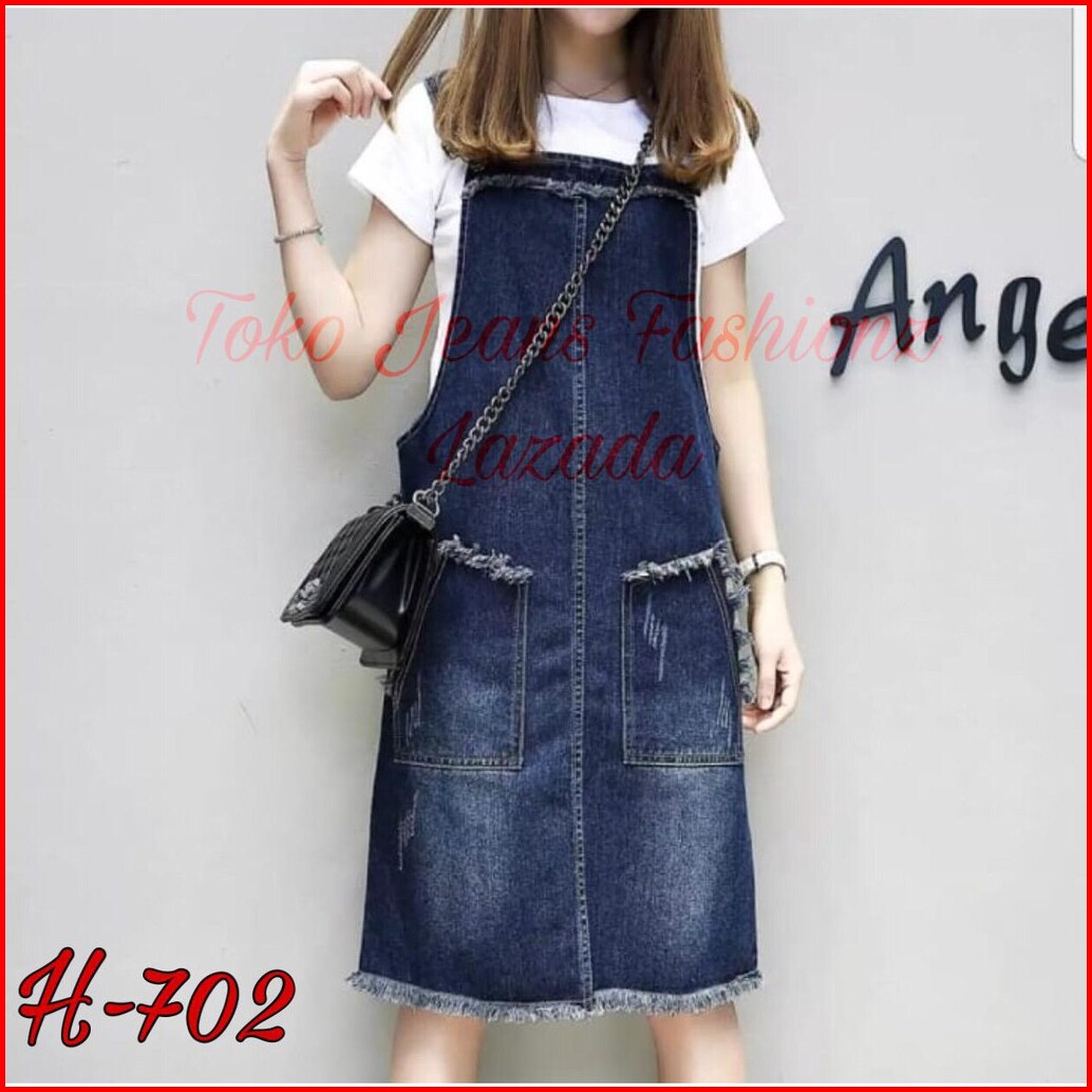 Dress Jeans Wanita Midi Overall Denim Soft Dark Blue
