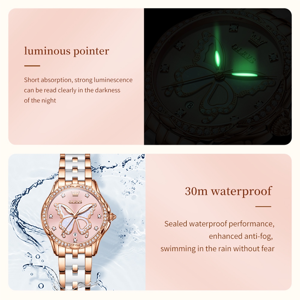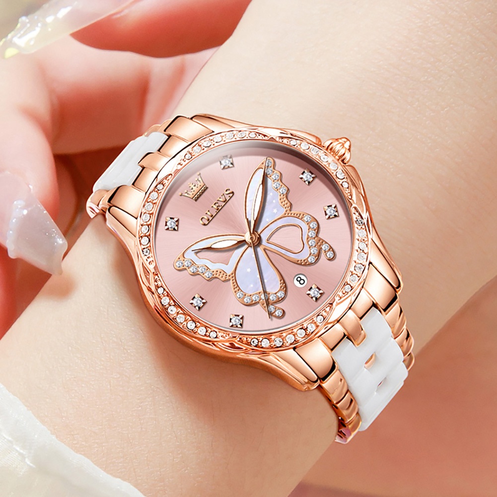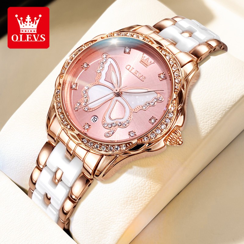 OLEVS JAM TANGAN WANITA ORIGINAL ANTI AIR ELEGAN FASHION PINK MEWAH KERAMIK WATCH WOMEN