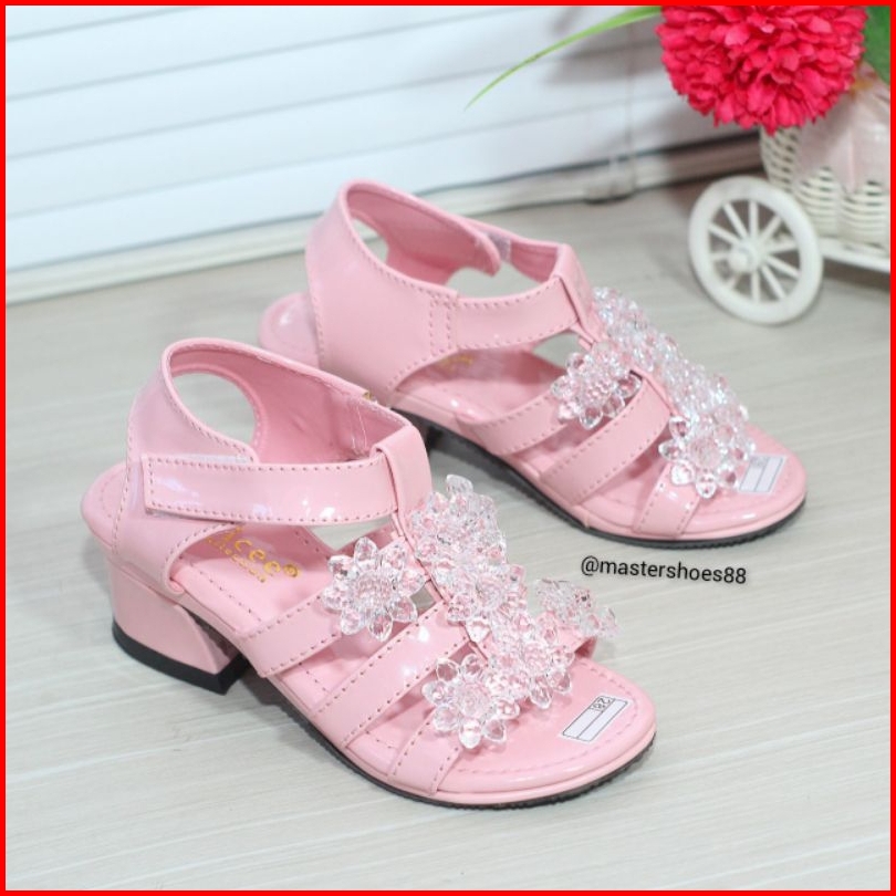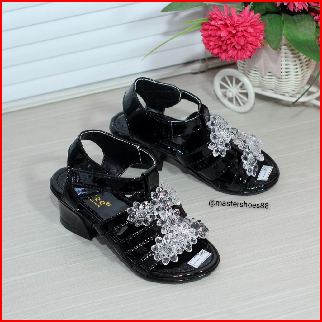 Master Ed06 - New Collection Sandal Selop Pesta Anak Glossy Hak Tahu 3cm Variasi Bunga Kaca