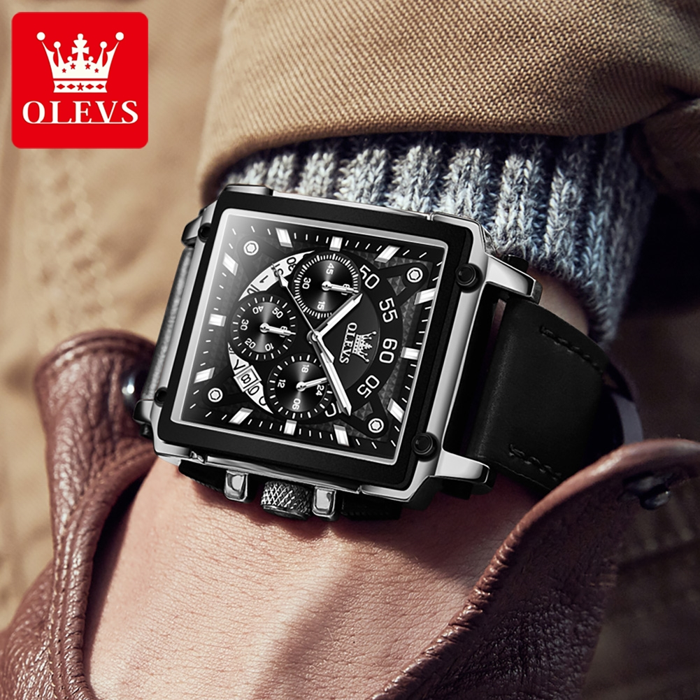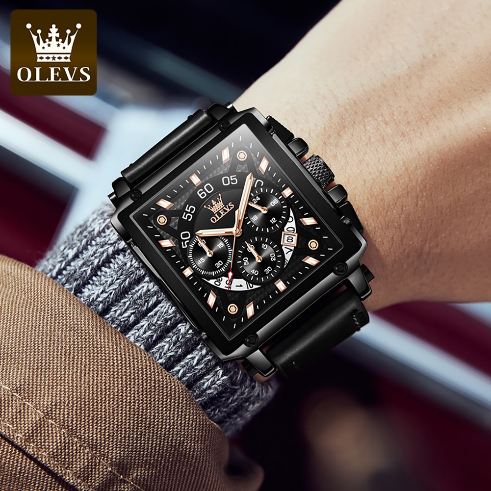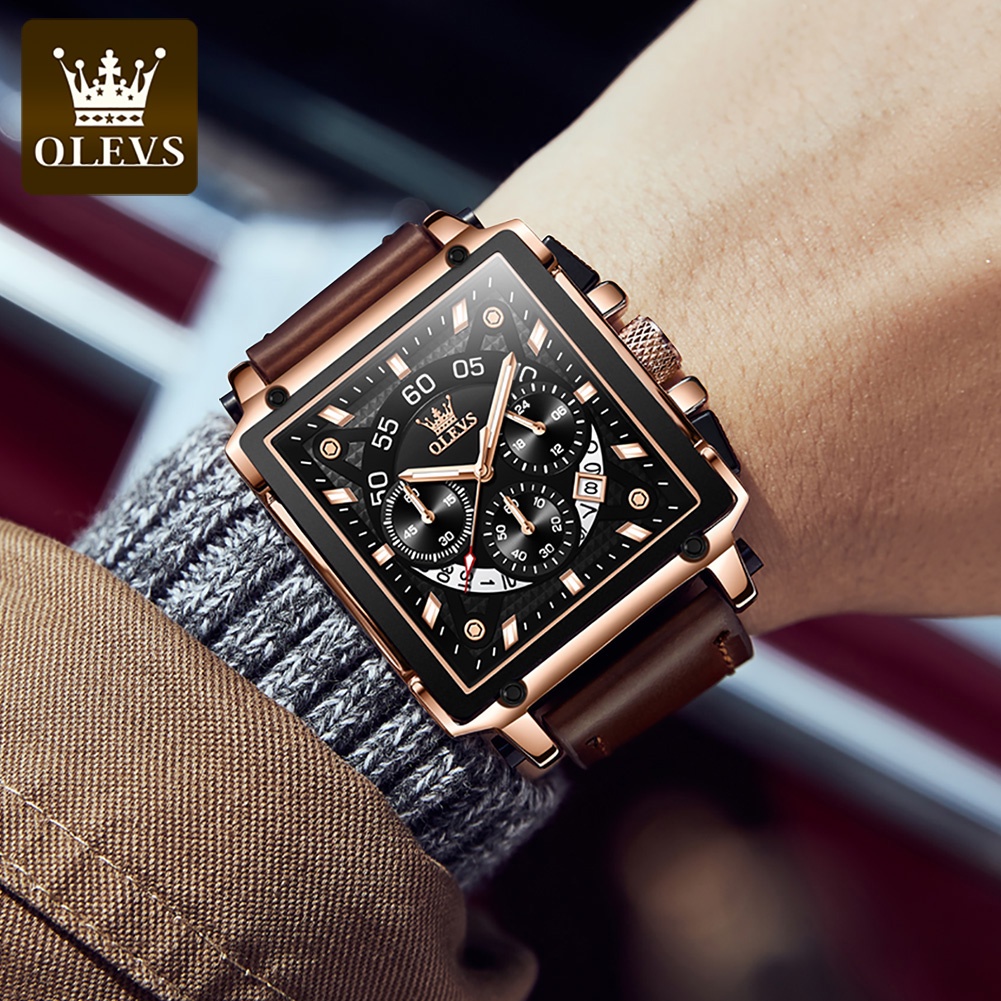 OLEVS JAM TANGAN PRIA KULIT ANTI AIR ORIGINAL ASLI TERBARU CASUAL TAHAN AIR SQUARE CHRONOGRAPH LEATHER