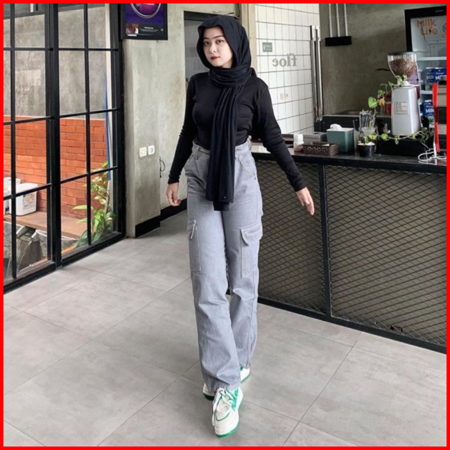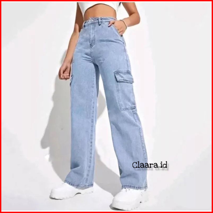 Celana Highwaist Cargo Jeans Wanita Loose Light Blue Boyfriend Kulot Jeans Korea