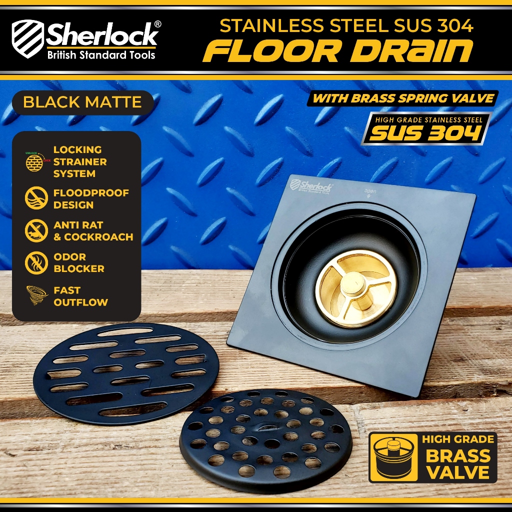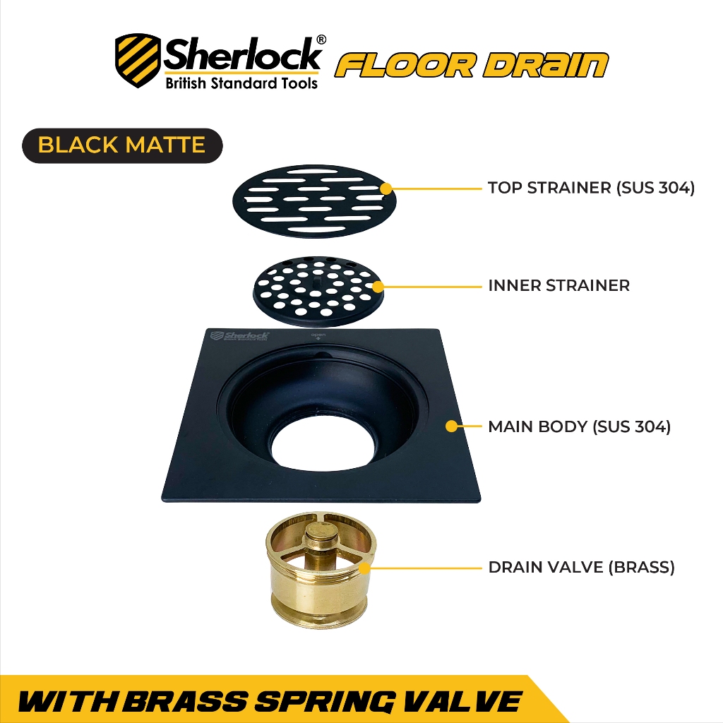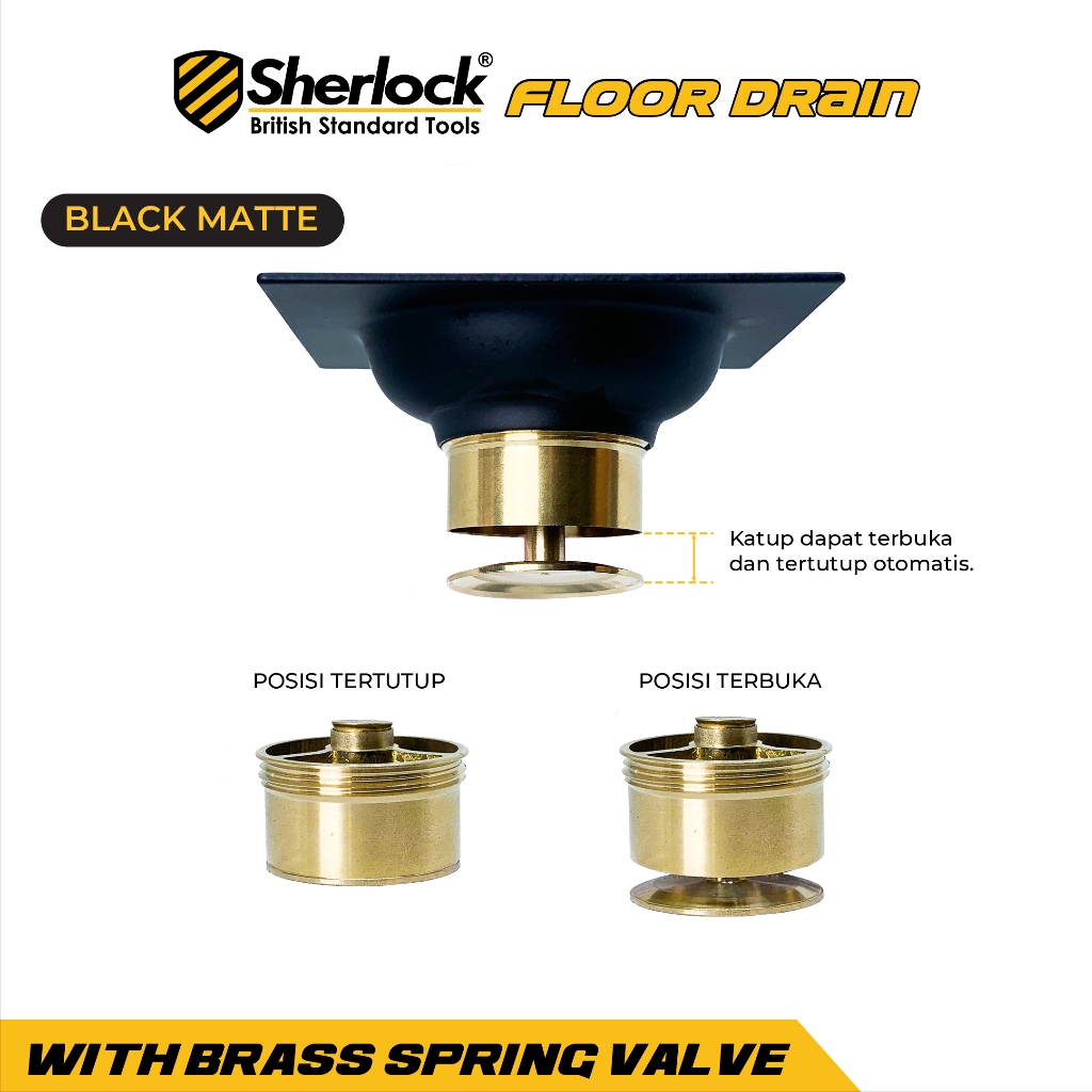 Sherlock Floor Drain SUS 304 Black Matte Saringan Air Got Kamar Mandi Anti Bau Spring Brass Valve
