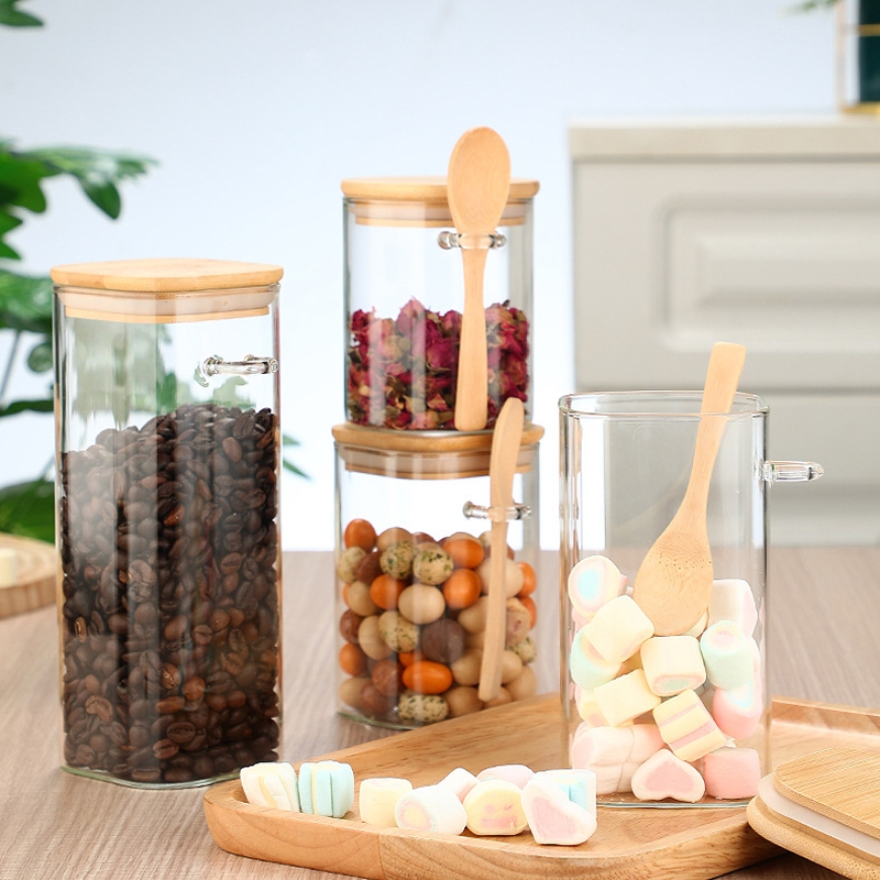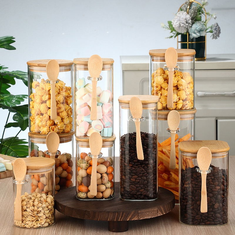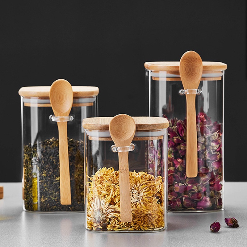 Toples Kaca Free Sendok Simpan Kopi Teh Gula Kedap Udara Tutup Bambu Bumbu Dapur Kedap Tempat Bumbu Stoples Penyimpanan