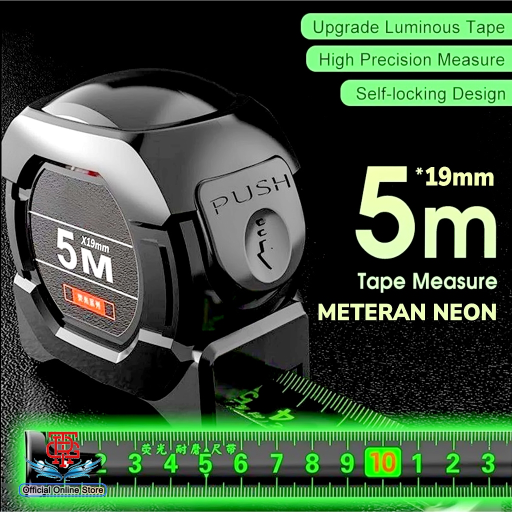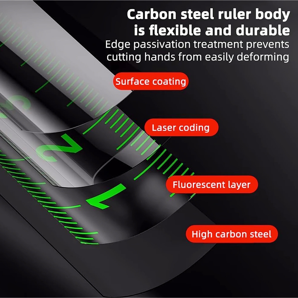 Meteran Neon Gulung Tukang Bangunan Kayu Besi Pita Pengukur Penggaris Fluorescence Black Self Locking Fluorescent Measur