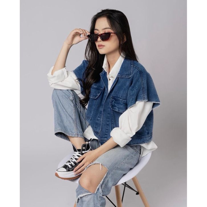 Pakaian Wanita Bahan Jeans Denim Lengan Pendek Cassandra Jacket Rompi Oversize