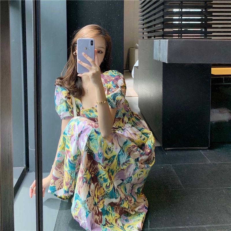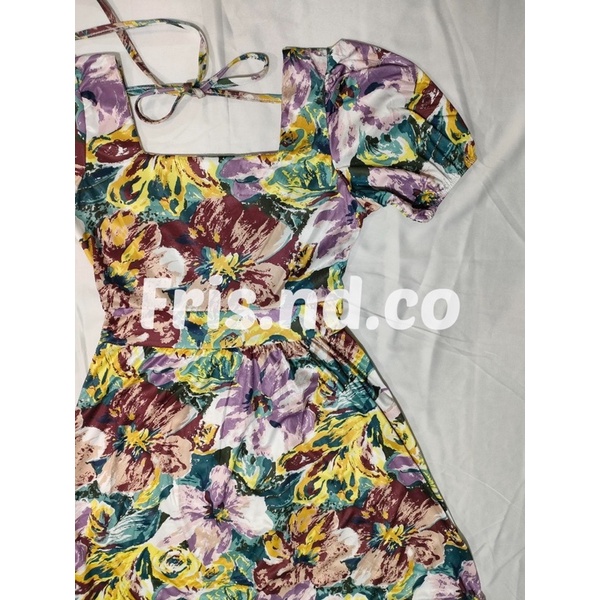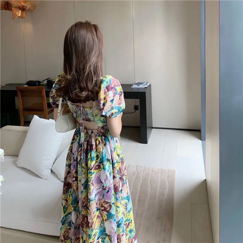 D129 - Korean Vintage Dress Motif Flower Backless Puffy / Gaun wanita motif bunga gaya Korea lengan balon
