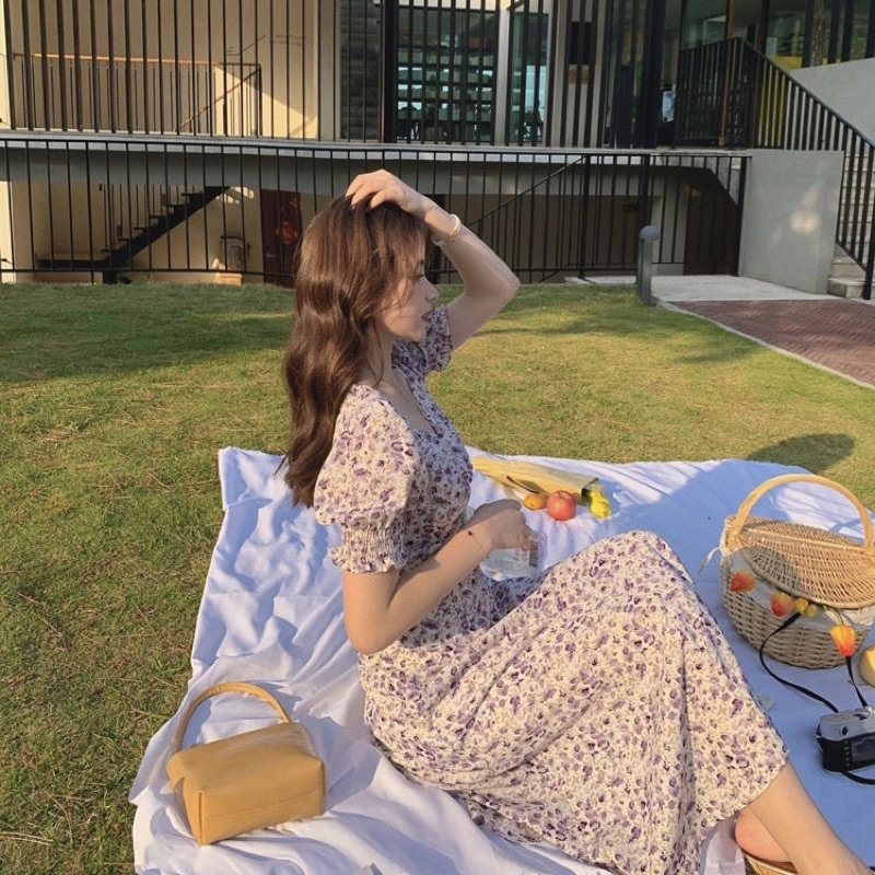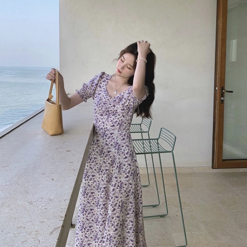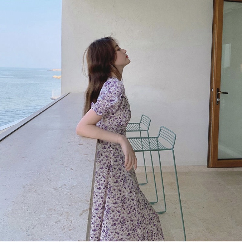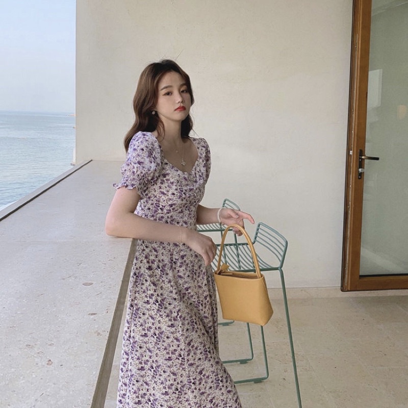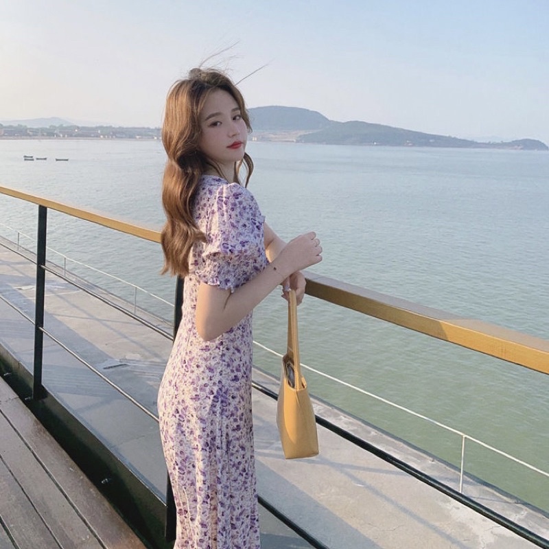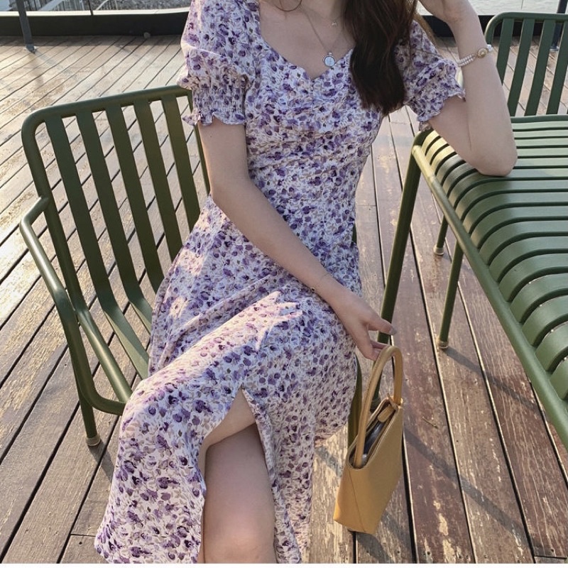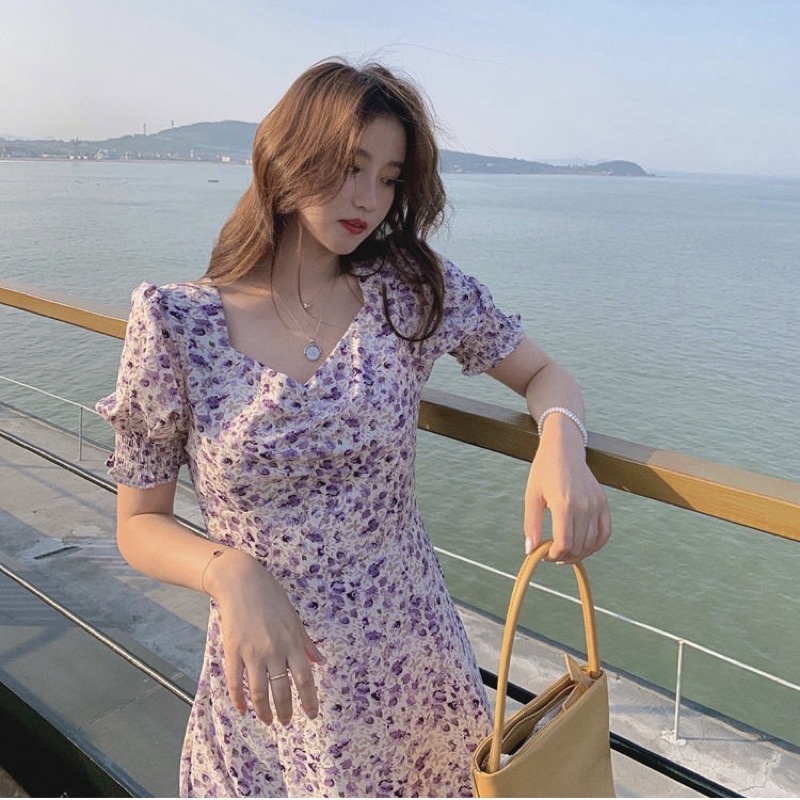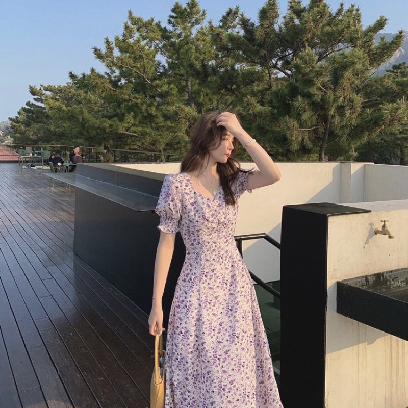 D111 - Lavender Dress / Korean vintage dress / Gaun wanita murah motif bunga bergaya korea kekinian import